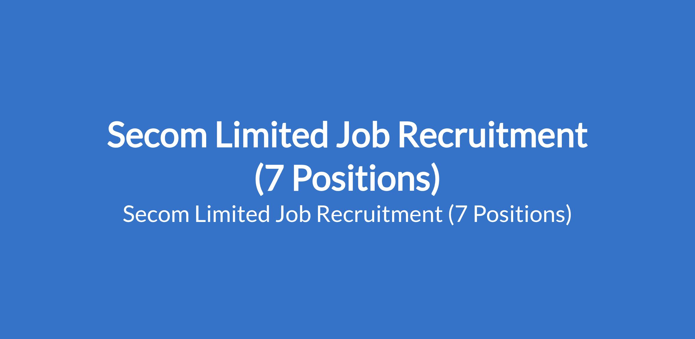 Secom Limited is recruiting suitably qualified candidates to fill the following positions in Lagos State: Male Factory Worker, Personal Driver, Tax Associate, Secondary Sales Representative, Korope Driver For Beverage Company, Accountant, and Storekeeper.