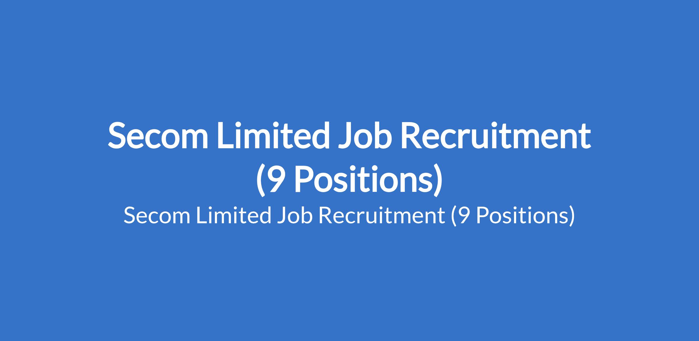 Secom Limited is recruiting suitably qualified candidates to fill the following positions in Lagos, Ekiti, Kwara, Ogun, & Ondo States: Storekeeper, Secondary Sales Representative, Primary Sales Representative, Chef (Specialty in Authentic Indian Cuisine), Korope Driver, Office Administrator, Factory Worker, and Administrative Assistant.