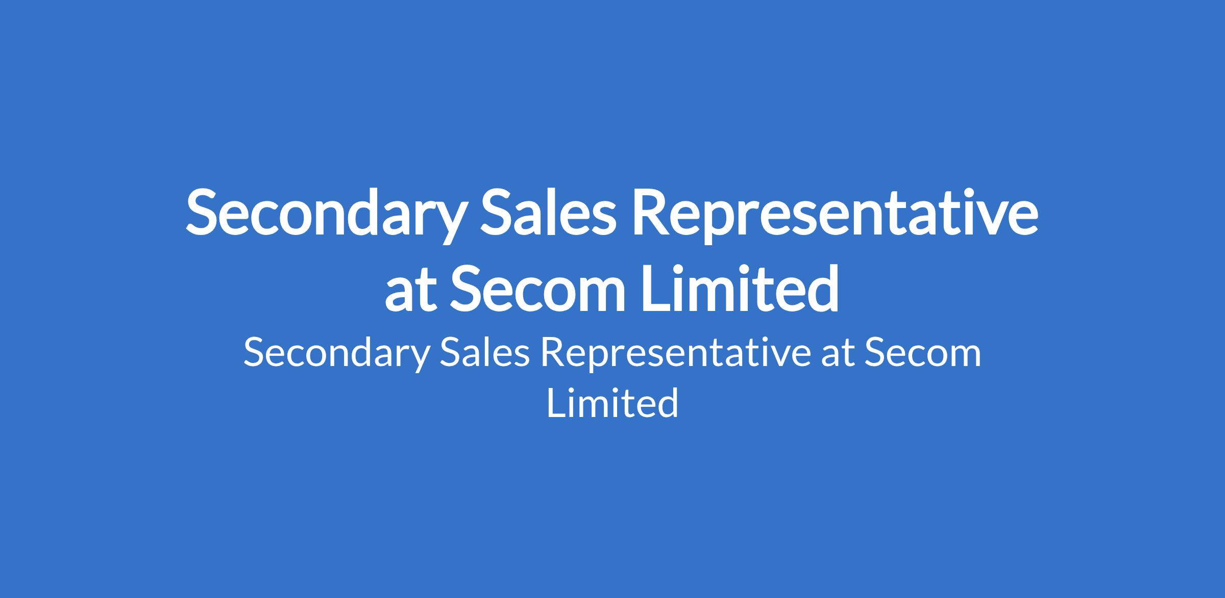 Secom Limited is recruiting to fill the position of: Secondary Sales Representative. The position is located in Agege, Ogba, Surulere, and Lekki Phase 1, Lagos State. Salary: N120,000 monthly. Interested candidates should possess a minimum of an HND /B.Sc in Marketing, Business Administration, or related field with 13 years experience in FMCG or field sales (mandatory).