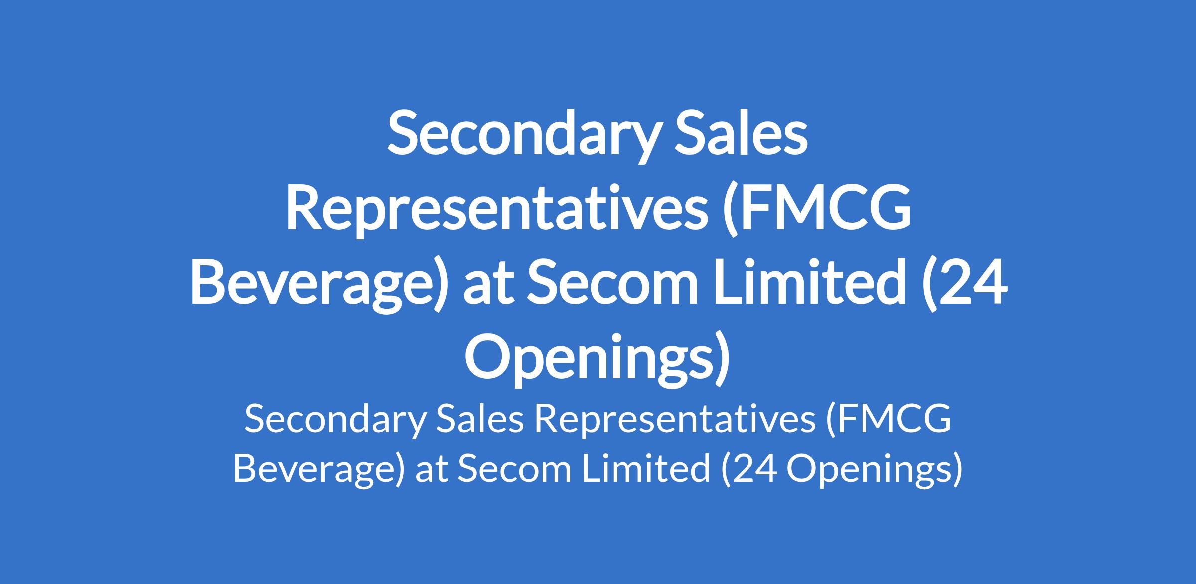 Secom Limited is recruiting to fill the position of: Secondary Sales Representative (FMCG Beverage). The position is located in Agege, Ogba, Surulere, Lekki Phase 1 - Lagos State. Salary: N120,000 per month. Interested candidates should possess a relevant qualification with 13 years FMCG / field sales experience.