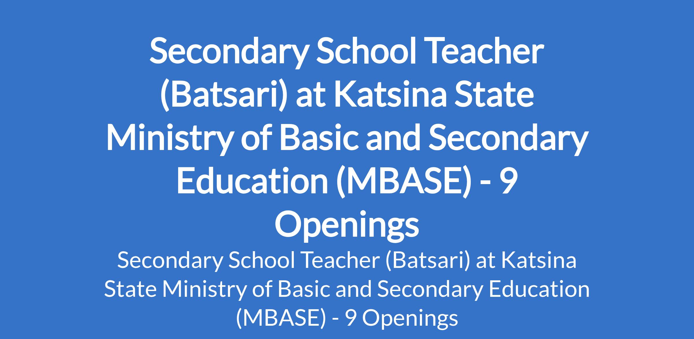 Katsina State Ministry of Basic and Secondary Education (MBASE) is inviting applications from suitable candidates to fill the position of: Secondary School Teacher. The position is located in Batsari, Katsina State. Interested candidates should possess a B.Ed in a relevant field or its equivalent.