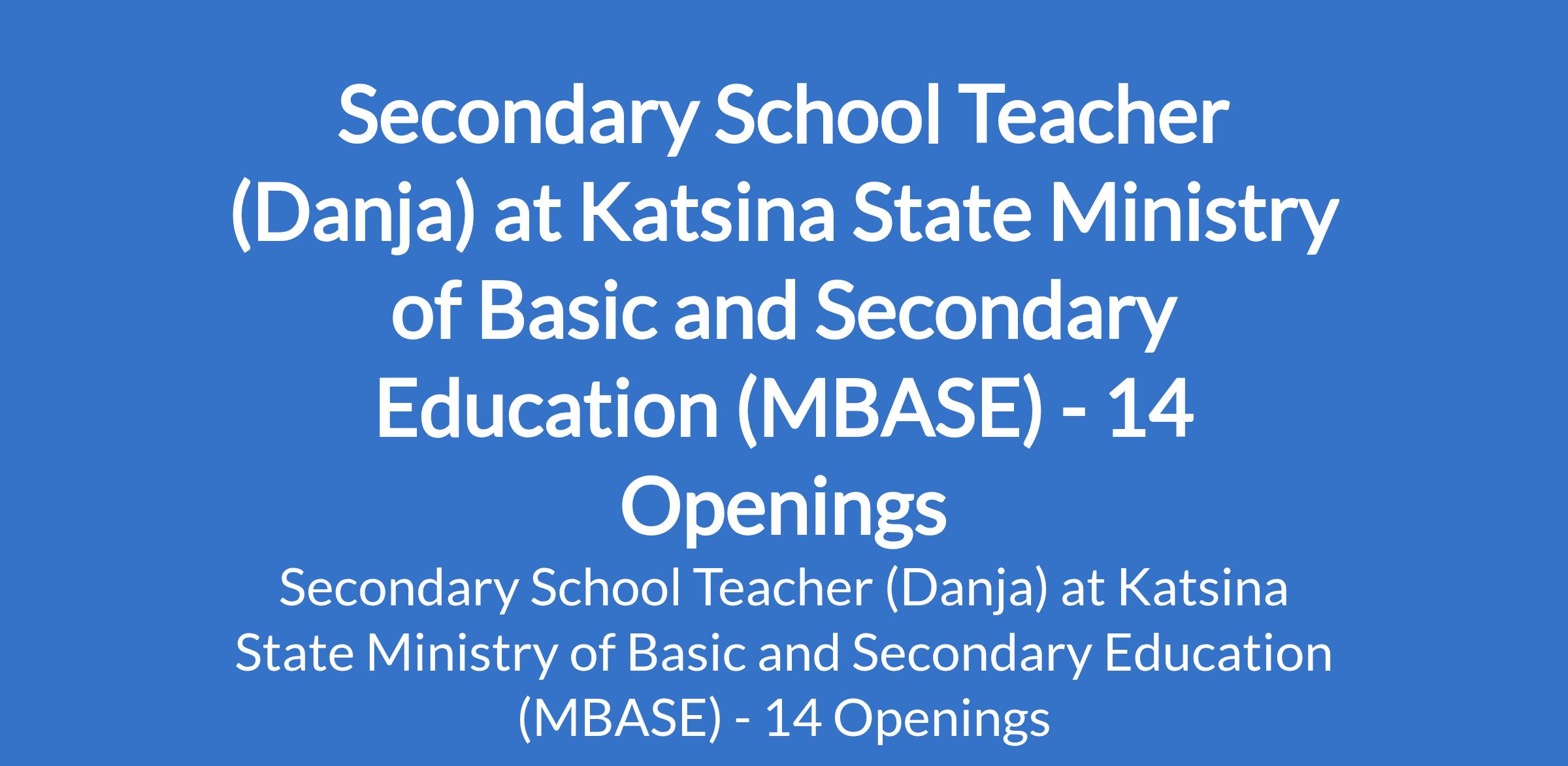 Katsina State Ministry of Basic and Secondary Education (MBASE) is inviting applications from suitable candidates to fill the position of: Secondary School Teacher. The position is located in Danja, Katsina State. Interested candidates should possess a B.Ed in a relevant field or its equivalent.