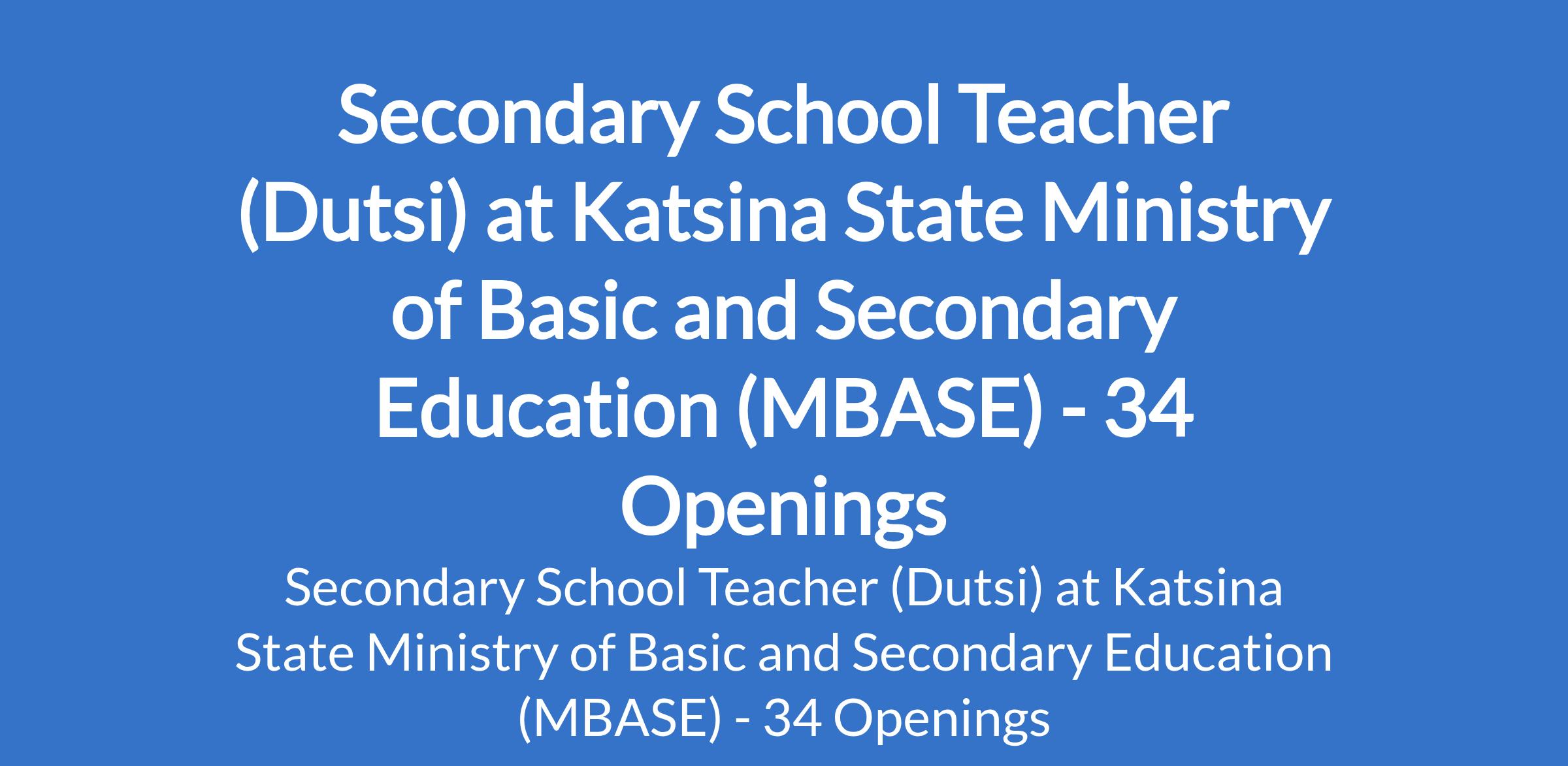 Katsina State Ministry of Basic and Secondary Education (MBASE) is inviting applications from suitable candidates to fill the position of: Secondary School Teacher. The position is located in Dutsi, Katsina State. Interested candidates should possess a B.Ed in a relevant field or its equivalent.