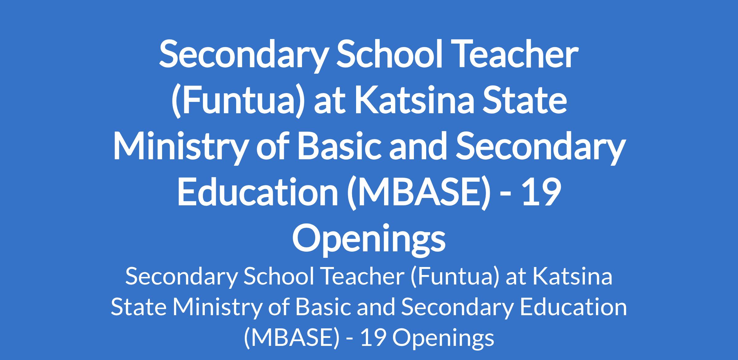 Katsina State Ministry of Basic and Secondary Education (MBASE) is inviting applications from suitable candidates to fill the position of: Secondary School Teacher. The position is located in Funtua, Katsina State. Interested candidates should possess a B.Ed in a relevant field or its equivalent.