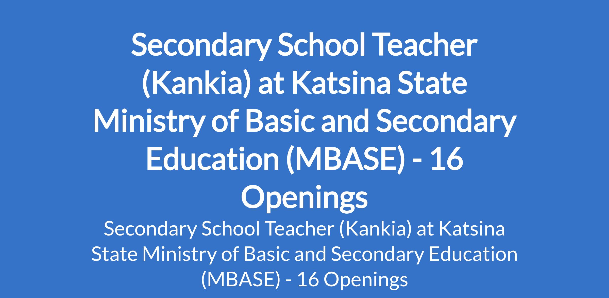 Katsina State Ministry of Basic and Secondary Education (MBASE) is inviting applications from suitable candidates to fill the position of: Secondary School Teacher. The position is located in Kankia, Katsina State. Interested candidates should possess a B.Ed in a relevant field or its equivalent.