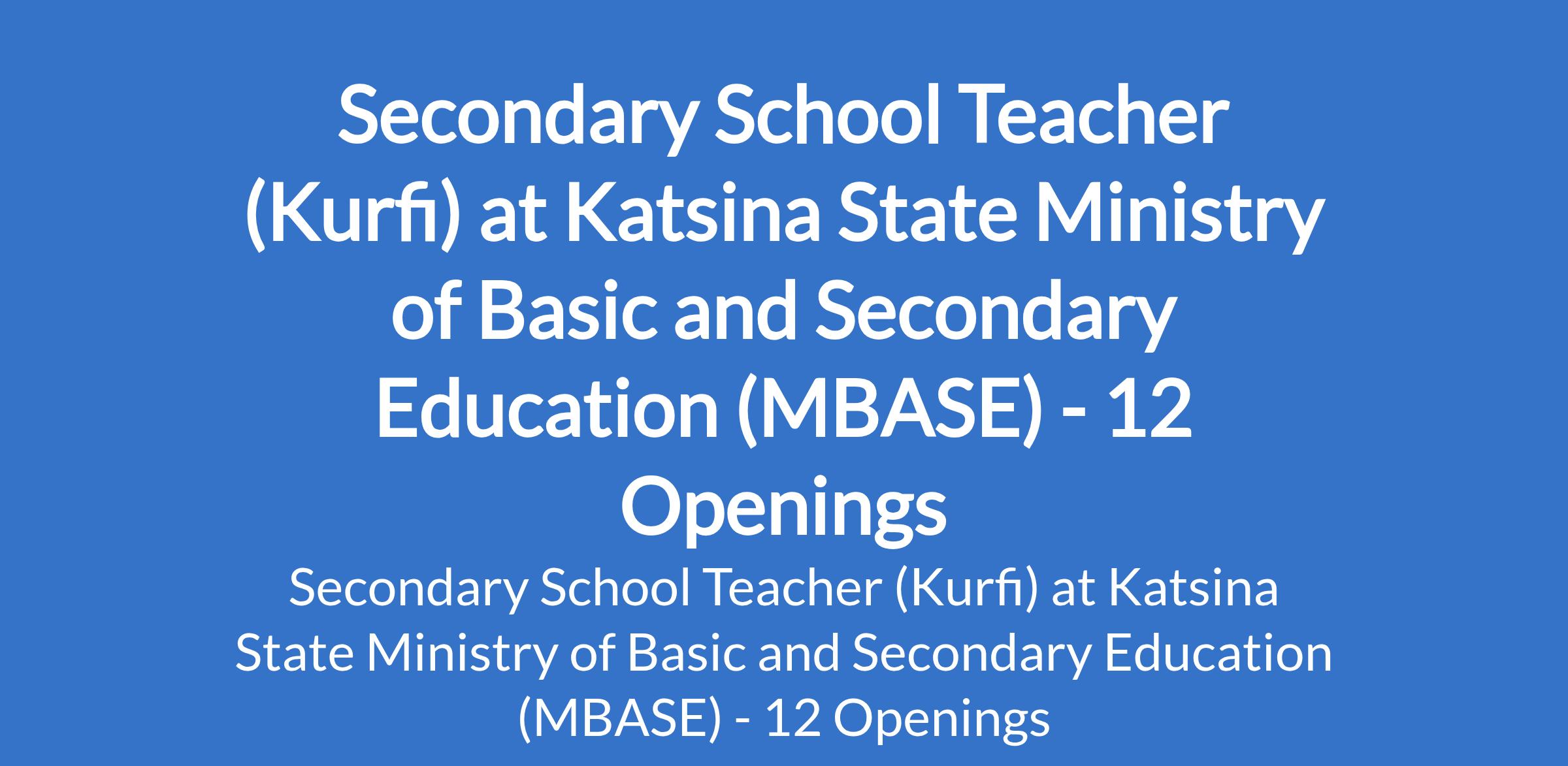 Katsina State Ministry of Basic and Secondary Education (MBASE) is inviting applications from suitable candidates to fill the position of: Secondary School Teacher. The position is located in Kurfi, Katsina State. Interested candidates should possess a B.Ed in a relevant field or its equivalent.