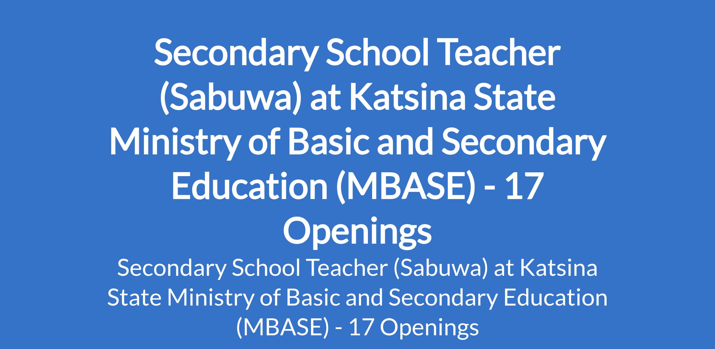 Katsina State Ministry of Basic and Secondary Education (MBASE) is inviting applications from suitable candidates to fill the position of: Secondary School Teacher. The position is located in Sabuwa, Katsina State. Interested candidates should possess a B.Ed in a relevant field or its equivalent.