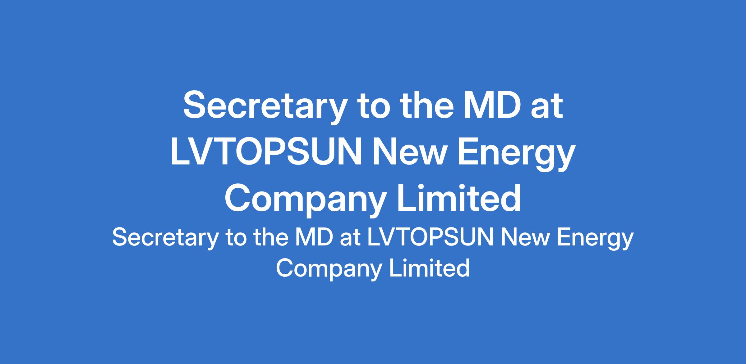 LVTOPSUN New Energy Company Limited is recruiting to fill the position of: Secretary to the MD. The position is located in Amuwo Odofin, Lagos State. Salary: N120,000 - N150,000 Monthly. Interested candidates should possess a B.Sc Degree / HND qualification in Business Administration, Office Management, Secretarial Studies, or a related field with 5 - 8 years work experience and should preferably be females residing around Okota, Amuwo Odofin and Festac axis.