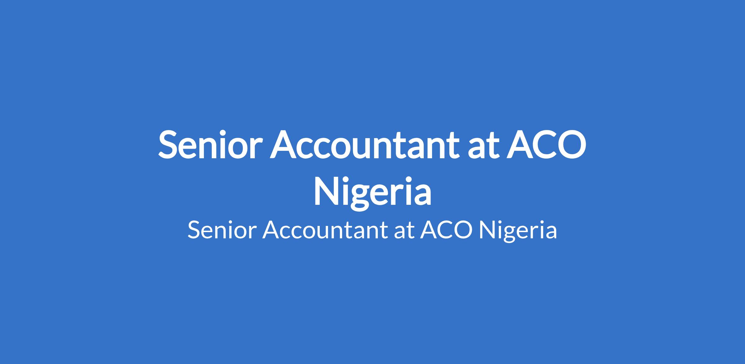 ACO Nigeria is recruiting to fill the position of: Senior Accountant. The position is located in Lagos State. Interested candidates should possess a Bachelors Degree in Accounting, Finance, or related field with 57 years of relevant accounting experience.