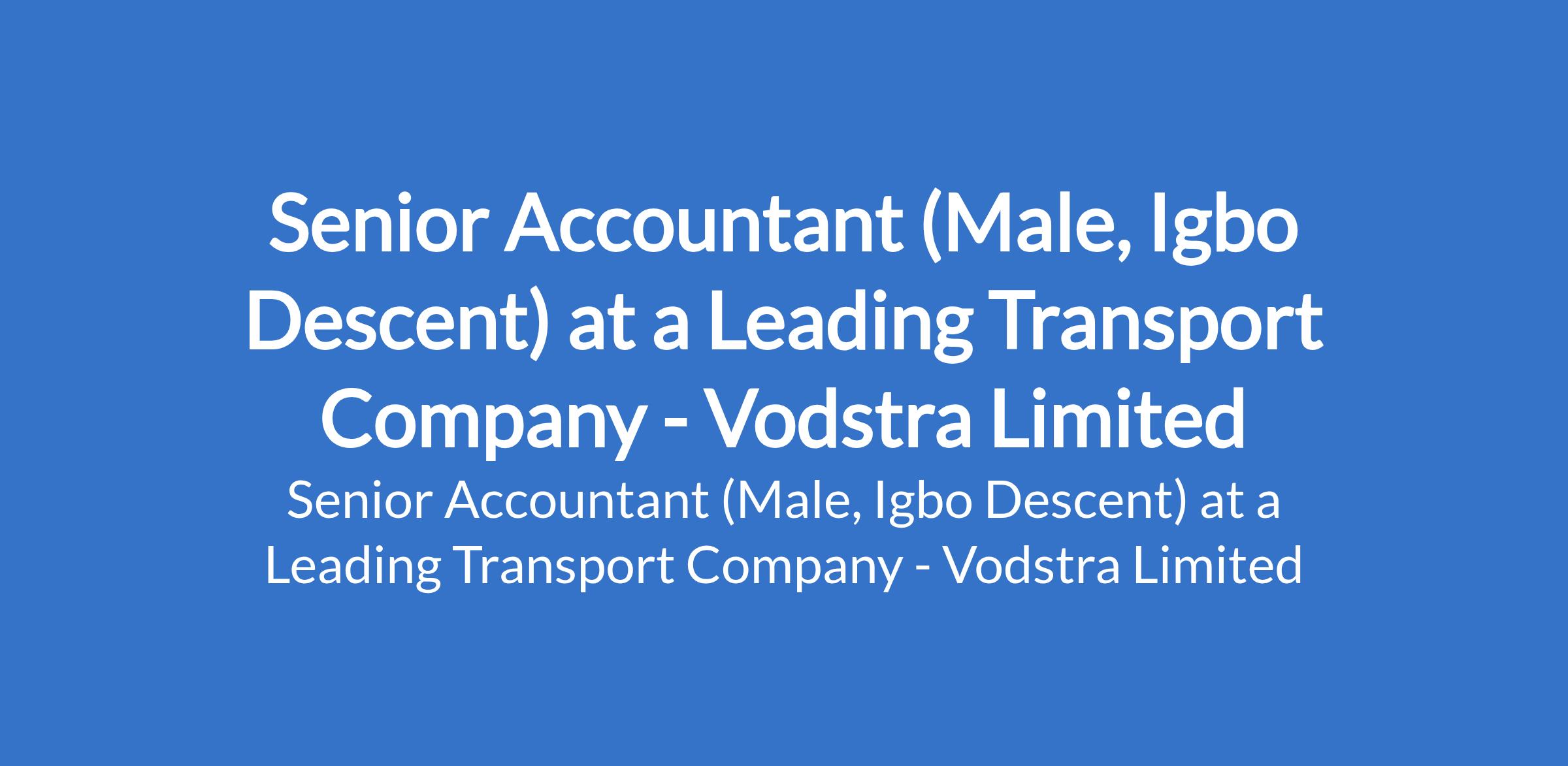 Vodstra Limited - Our client, a leading transport company is recruiting to fill the position of: Senior Accountant (Male, Igbo Descent). The position is located in Lagos State. Interested candidates should be a Male, of Igbo descent with a minimum of 5 years in a managerial accounting role, with demonstrable leadership experience.