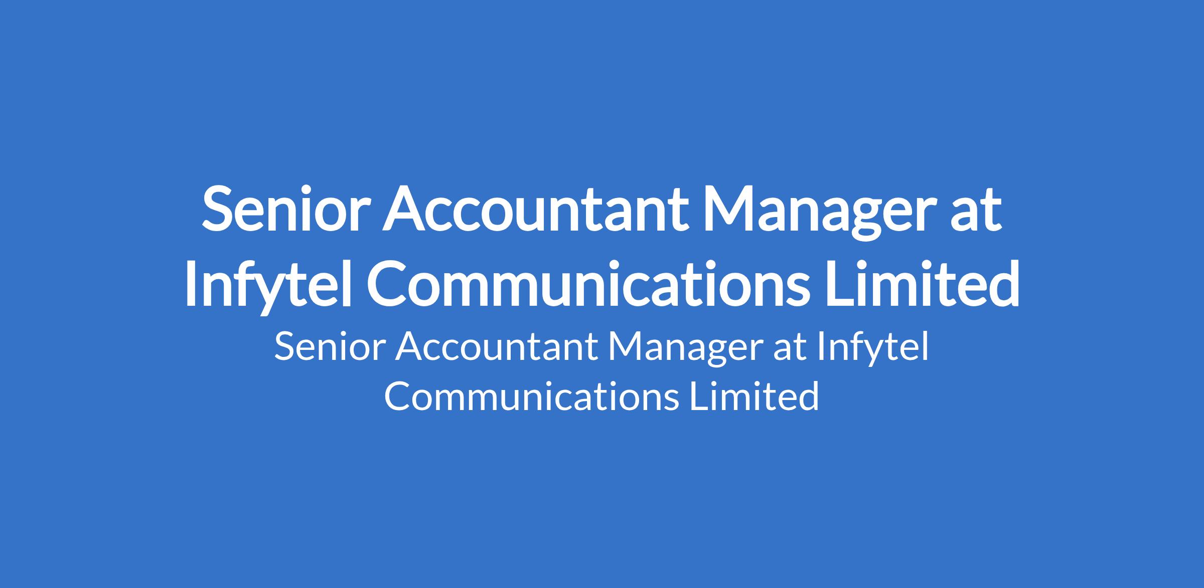Infytel Communications Limited is recruiting to fill the position of: Senior Accountant Manager. The position is located in Port Harcourt, Rivers State. Interested candidates should possess a B.Sc. Degree in Accounting/Finance; ACA/ACCA/ICAN (or in view) with 5+ years accounting experience.