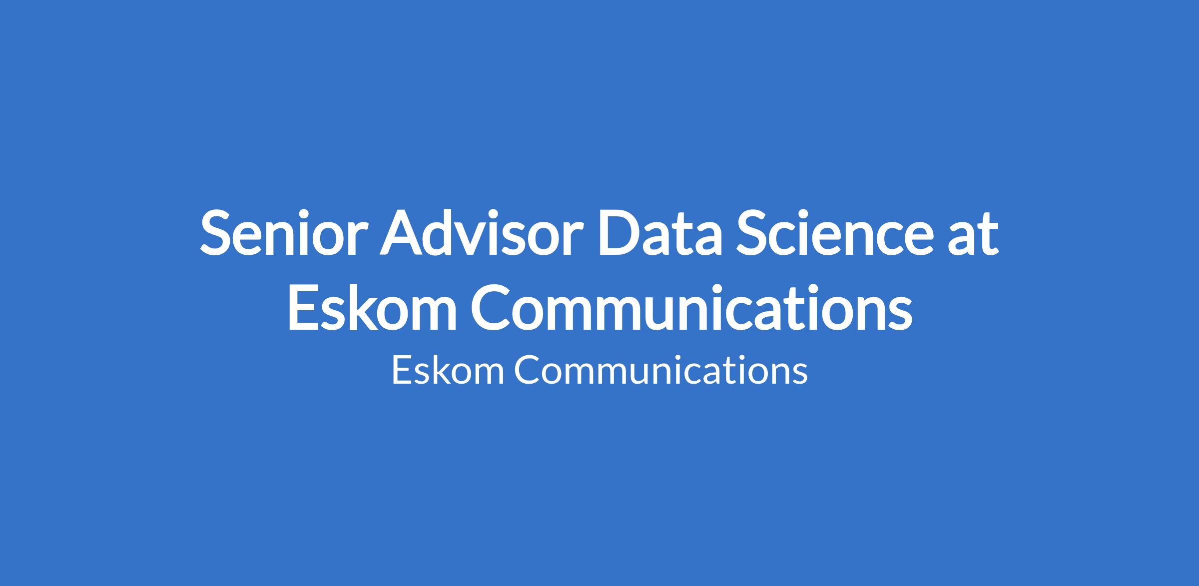 Position: Snr Advisor Data Science Task Grade: G16 Area of specialization: To design artificial intelligence (AI), machine learning (ML) and deep learning (DL) solutions for the division by leveraging advanced data analytics to improve business outcomes while deriving value for business. Department: Market Operator Business Unit: Energy Market Services Location: Simmerpan - Germiston, Gauteng