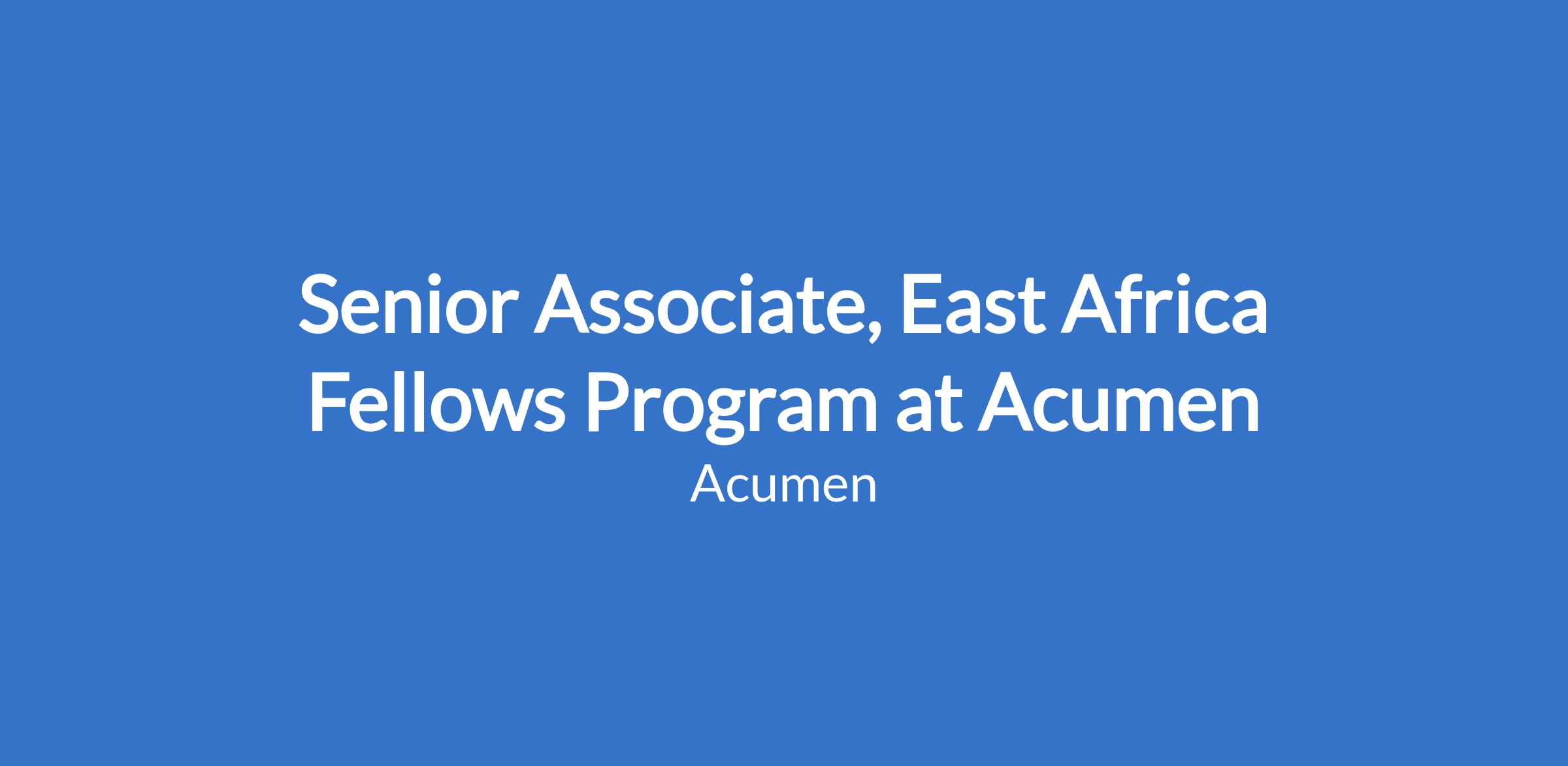 The Senior Associate will support program delivery, facilitation, outreach, recruitment, and operations for the Climate-Focused Fellowship Program in East Africa.This role will work closely with Fellows, Acumen Academy's West Africa teams, and external partners to ensure high-quality program execution from recruitment through graduation. The position reports directly to the East Africa Program Lead.The ideal candidate is a self-starter, highly detail-oriented, and energized by working in a fast-paced environment while supporting meaningful learning experiences.