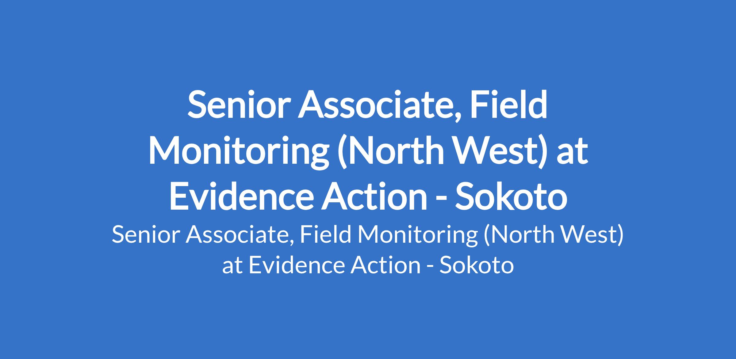 Evidence Action is recruiting to fill the position of: Senior Associate, Field Monitoring (North West). The position is located in Sokoto State. Interested candidates should possess a Bachelor's Degree in a relevant field such as Public Health, Biology, Microbiology, Nutrition, Monitoring and Evaluation, Health Economics, Statistics, or Mathematics with 6+ years of program M&E experience in Nigeria, specifically related to public health programs.