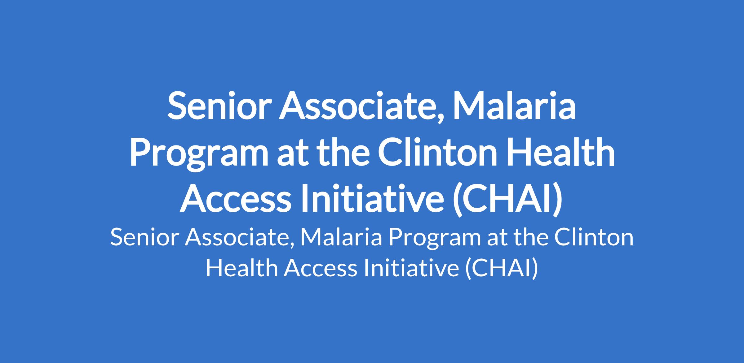 The Clinton Health Access Initiative (CHAI) is recruiting to fill the position of: Senior Associate, Malaria Program. The position is located in Abuja. Interested candidates should possess a Bachelor's Degree in a related field (e.g., Pharmacy, Marketing, Business, other health related field) with 35 years of relevant professional experience in public health, preferably with exposure to pharmaceutical retail, or service delivery scale-up; experience with similar projects is an added advantage.