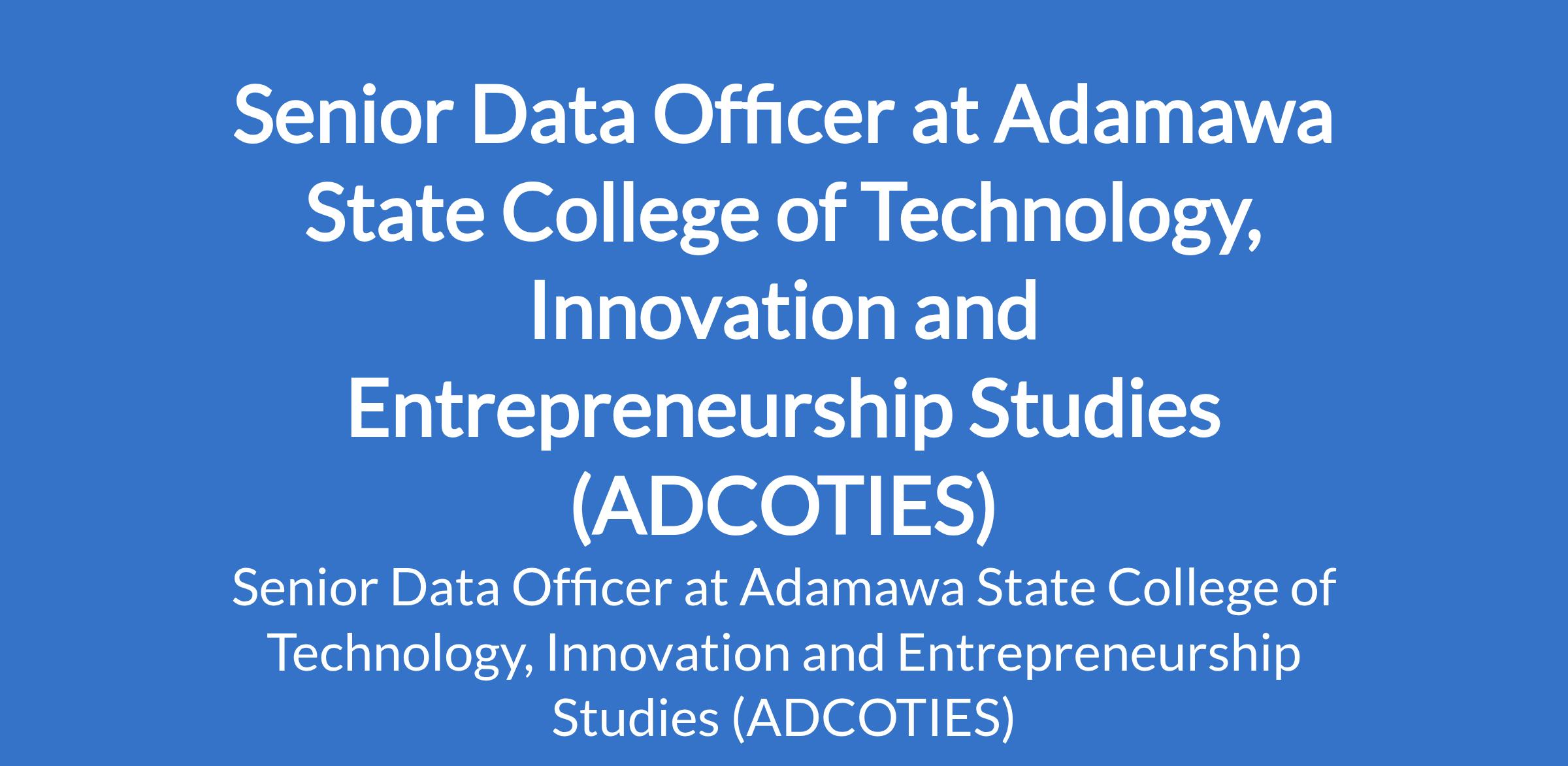 Adamawa State College of Technology, Innovation and Entrepreneurship Studies (ADCOTIES) is recruiting to fill the position of: Senior Data Officer. The position is located in Gulak, Adamawa State. Interested candidates should possess an HND in Computer Science, Statistics relevant discipline with a minimum of Upper Credit pass from a recognised Institution plus NYSC discharge or exemption certificate.