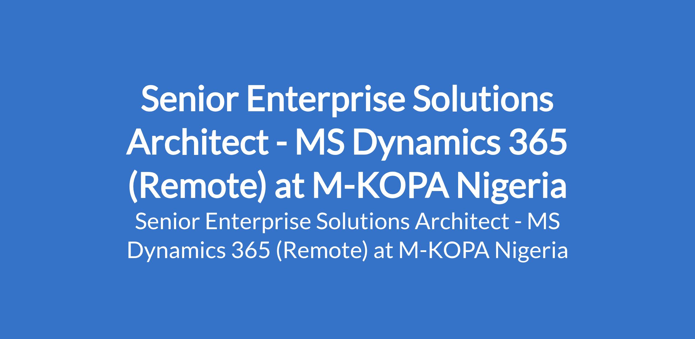 M-KOPA Nigeria is recruiting to fill the position of: Senior Enterprise Solutions Architect - MS Dynamics 365 (Remote). The position is located in Lagos State. Interested candidates should possess relevant qualifications with 5+ years designing, configuring, and deploying Microsoft D365 Finance & Operations solutions.