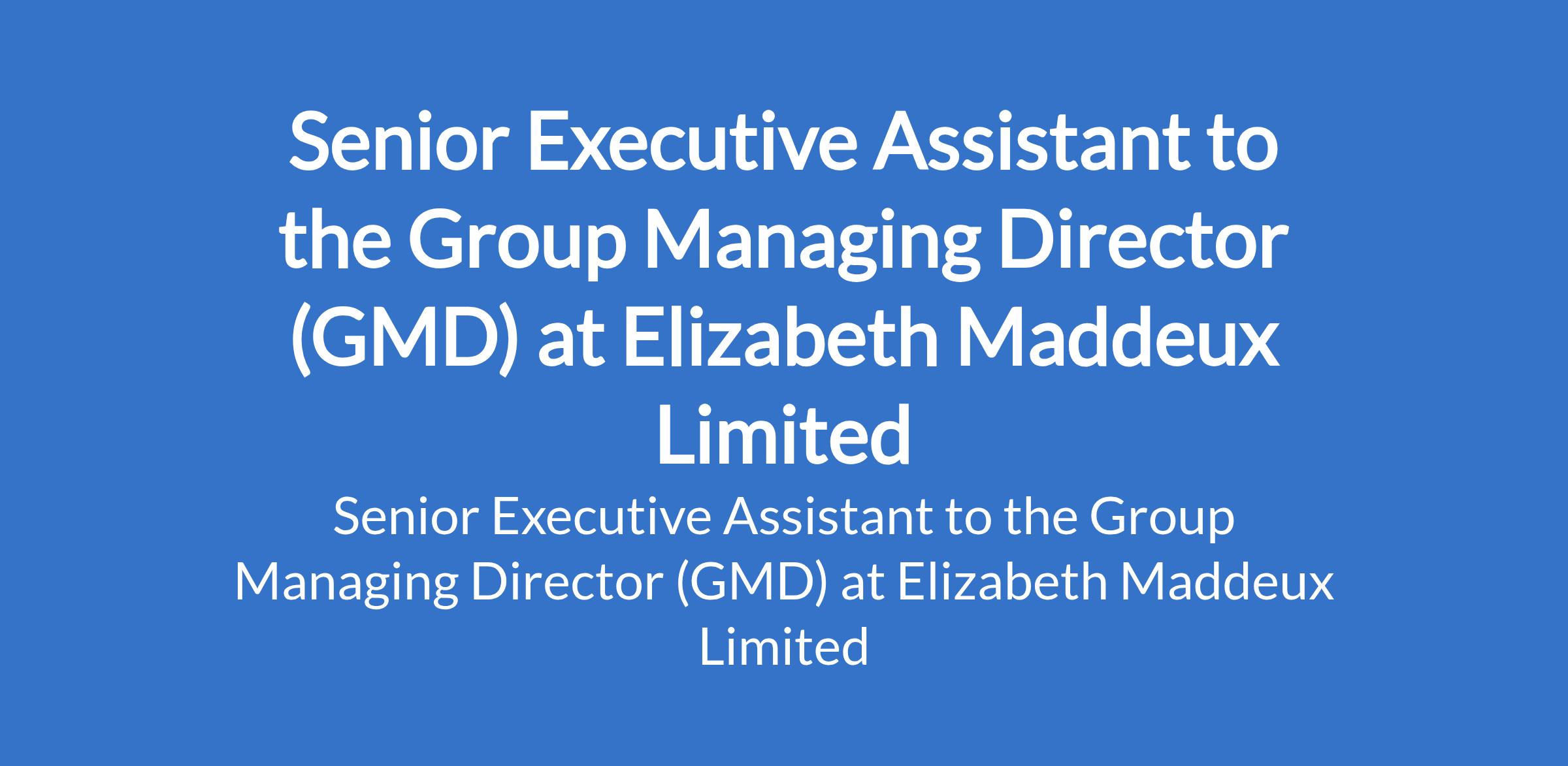Elizabeth Maddeux Limited is recruiting to fill the position of: Senior Executive Assistant to the Group Managing Director (GMD). The position is located in Lagos State. Salary: N750,000 - N1,000,000 / month. Interested candidates should possess a Bachelors Degree in Management or related field with a minimum of 10 years experience in Executive Management with at least 5 years supporting a C-suite executive.