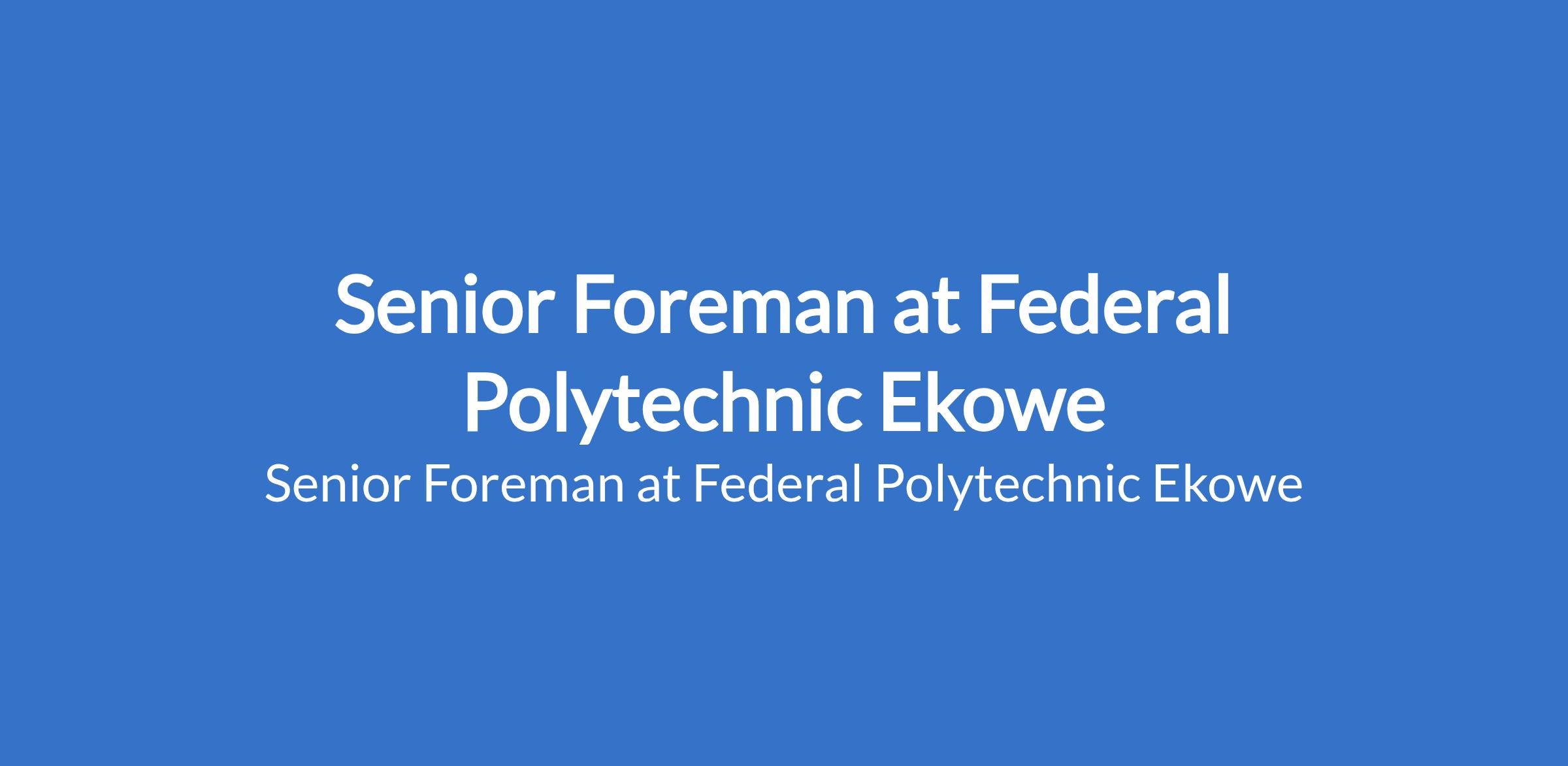 The Federal Polytechnic Ekowe invites applications from suitably qualified candidates for the position of: Senior Foreman. The position is located in Bayelsa State. Interested candidates should possess a Trade Test Certificate Grode (NTC, TRADE TEST) and minimum of six (6) years post-qualification cognate experience.