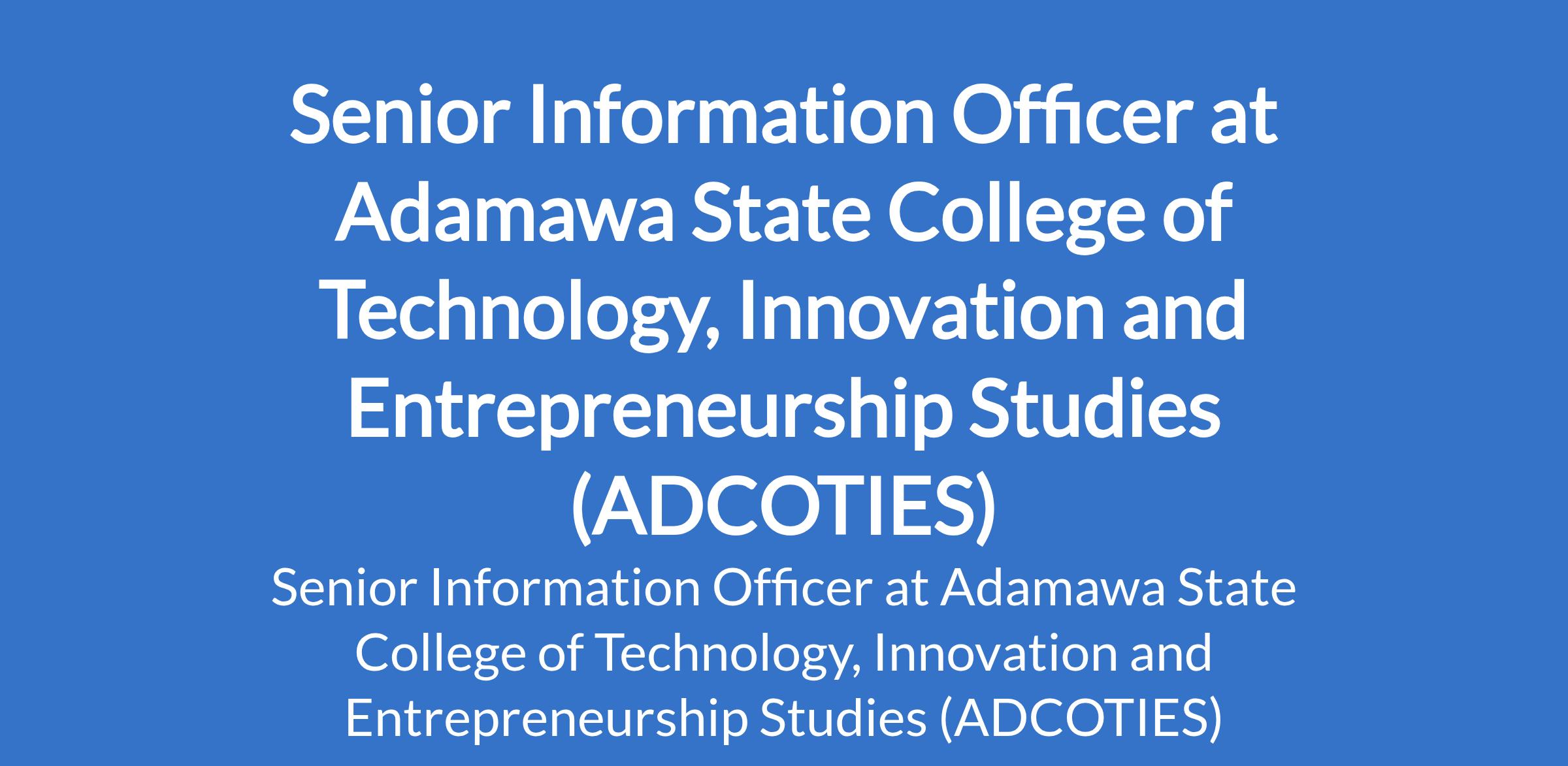 Adamawa State College of Technology, Innovation and Entrepreneurship Studies (ADCOTIES) is recruiting to fill the position of: Senior Information Officer. The position is located in Gulak, Adamawa State. Interested candidates should possess a Bachelor's Degree (minimum of Second Class Lower) in relevant discipline from a recognised institution plus NYSC discharge or exemption certificate with 6 years post-qualification cognate working experience and must be an indigene of Adamawa.