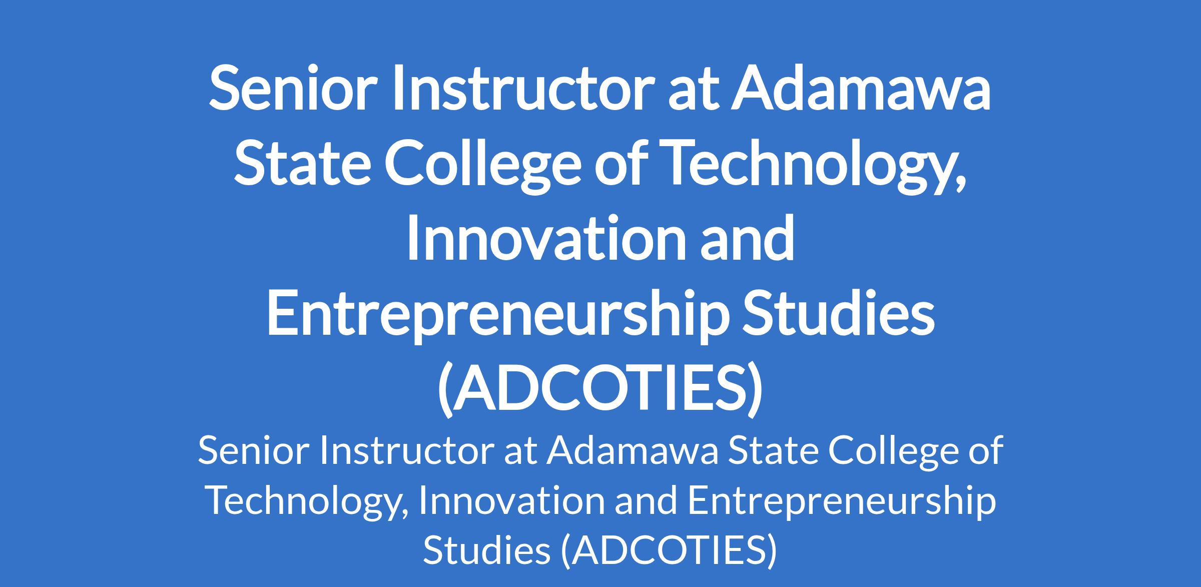 Adamawa State College of Technology, Innovation and Entrepreneurship Studies (ADCOTIES) is recruiting to fill the position of: Senior Instructor. The position is located in Gulak, Adamawa State. Interested candidates should possess a Bachelors Degree with minimum of Second Class Lower or HND at minimuen of Upper Credit in relevant discipline from a recognised institution with NYSC discharge or exemption certificate plus 6 years.