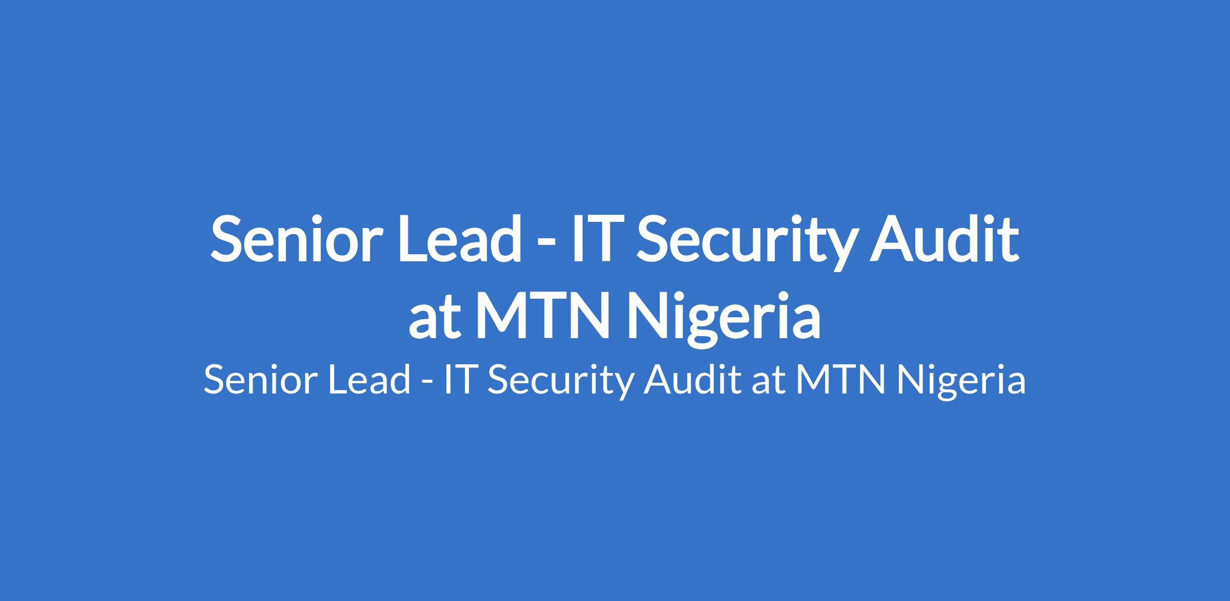 MTN Nigeria is recruiting to fill the position of: Senior Lead - IT Security Audit. The position is located in Ikoyi, Lagos State. Interested candidates should possess a First Degree in Electrical / Electronics, Computer Engineering, Telecommunications, or Computer Science with strong predilection for engineering; or in any Systems oriented discipline with 3 7 years experience in an area of specialisation.