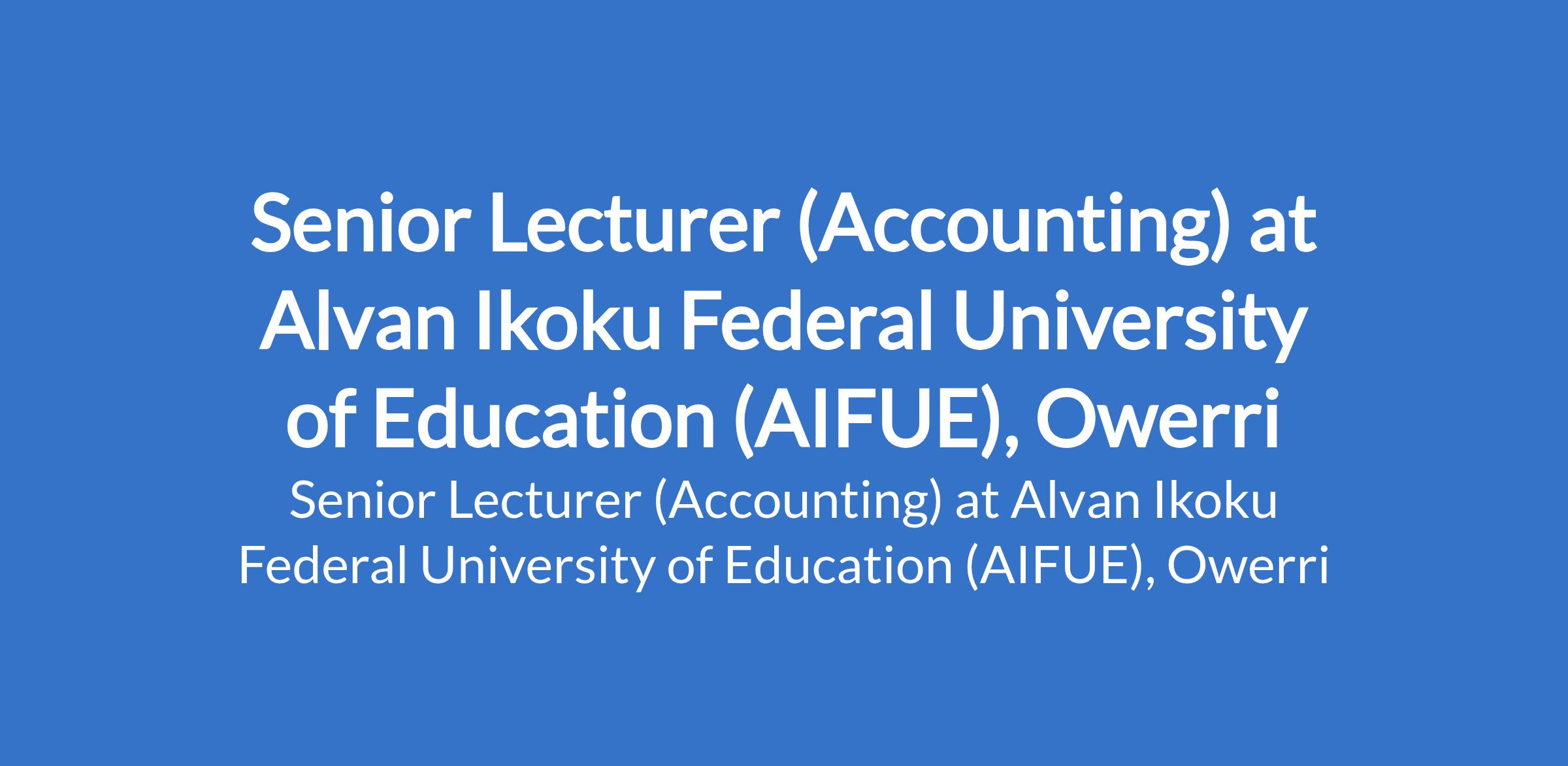 Alvan Ikoku Federal University of Education (AIFUE), Owerri invites applications from suitably qualified candidates for the position of: Senior Lecturer (Accounting). The position is located in Imo State. Interested candidates should possess a PhD with not less than nine (9) years of teaching and research experience, and not less than three (3) years as a Lecturer I in a recognized university.