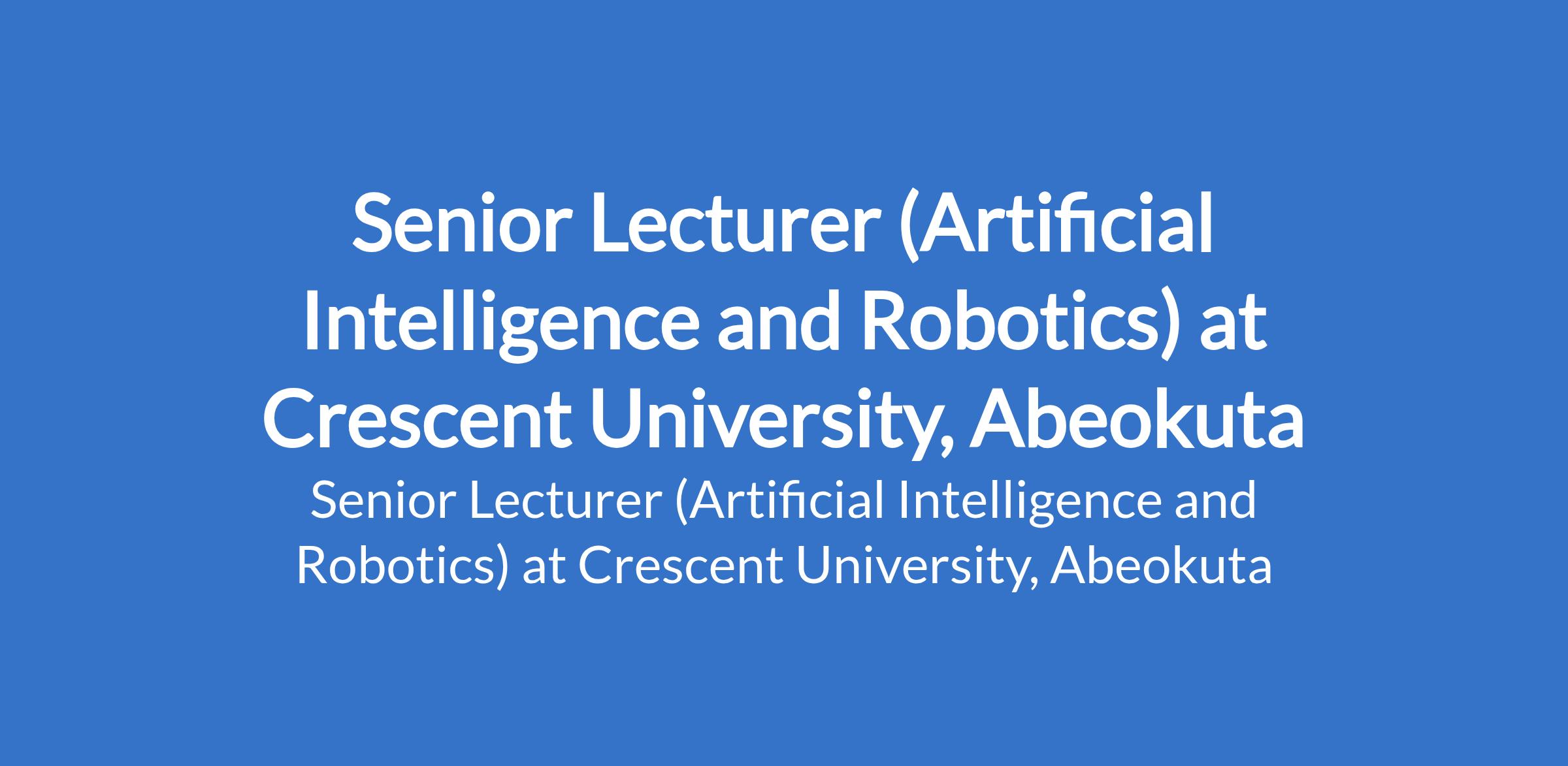 Crescent University, Abeokuta invites applications from suitable candidates to fill the position of: Senior Lecturer (Artificial Intelligence and Robotics). The position is located in Ogun State. Interested candidates should possess a PhD in Computing with at least 14 sound scholarly articles in journals in areas relevant to the discipline.