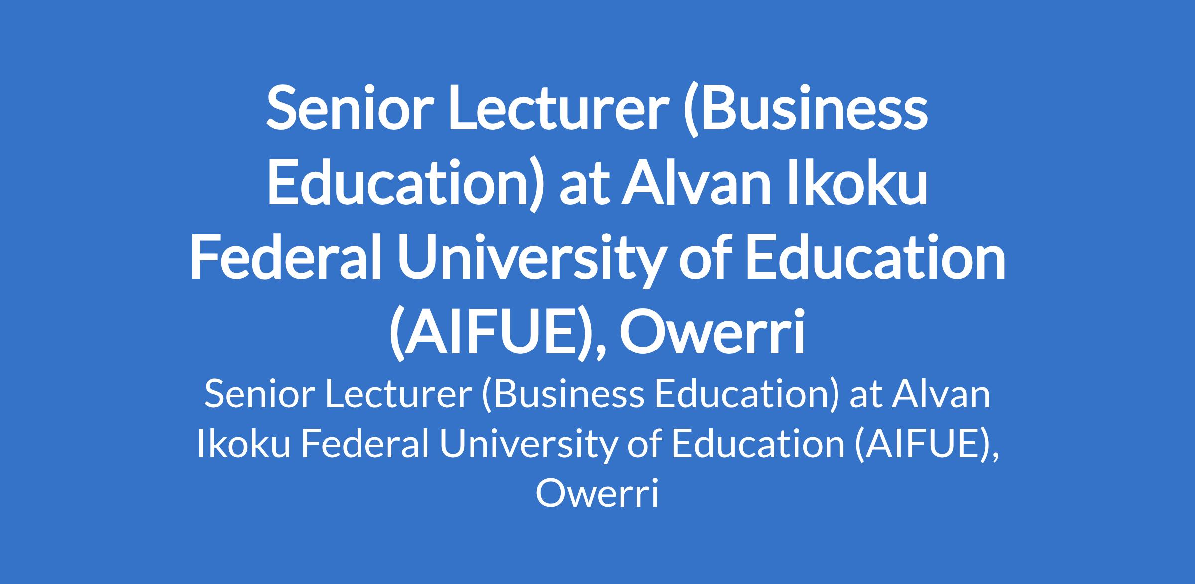 Alvan Ikoku Federal University of Education (AIFUE), Owerri invites applications from suitably qualified candidates for the position of: Senior Lecturer (Business Education). The position is located in Imo State. Interested candidates should possess a PhD with not less than nine (9) years of teaching and research experience, and not less than three (3) years as a Lecturer I in a recognized university.