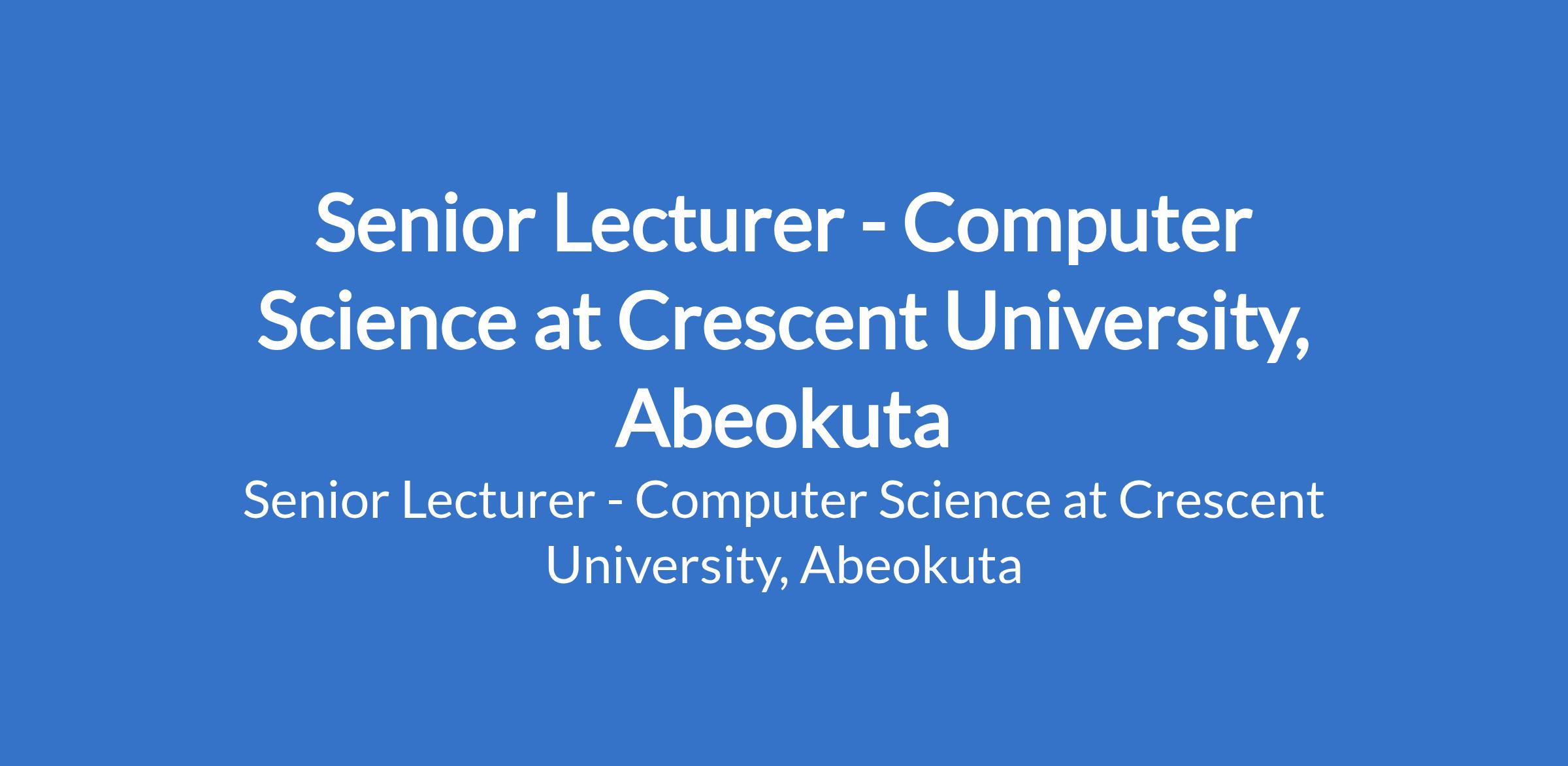 Crescent University, Abeokuta invites applications from suitable candidates to fill the position of: Senior Lecturer - Computer Science. The position is located in Abeokuta, Ogun State. Interested candidates should possess a PhD Degree in Computing with at least 14 sound scholarly articles in journals in areas relevant to the discipline with at least five years full-time teaching experience in a university.