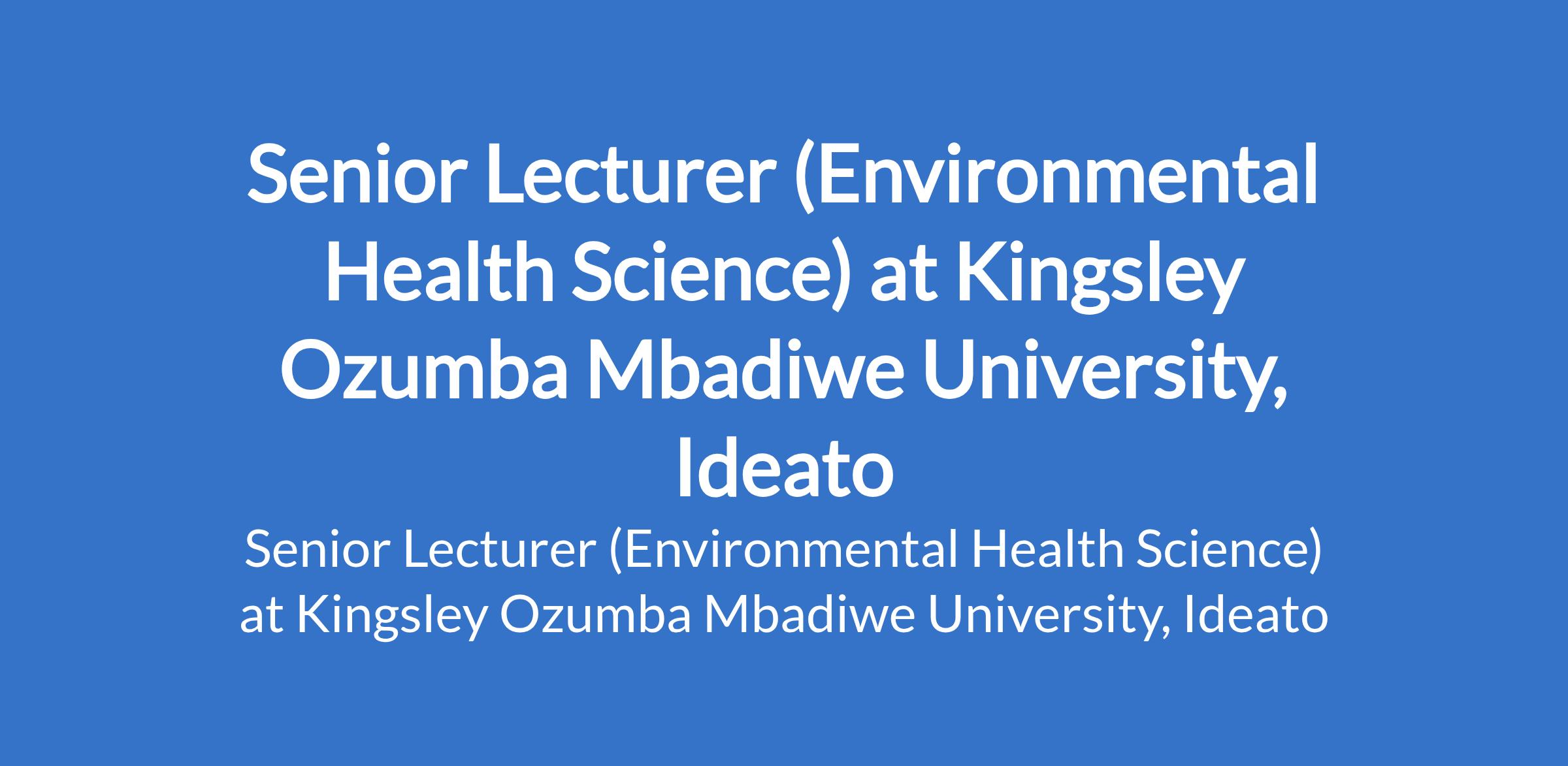 Kingsley Ozumba Mbadiwe University, Ideato invites applications for the position of: Senior Lecturer (Environmental Health Science). The position is located in Imo State. Interested candidates should possess a Doctorate Degree in the relevant field plus a minimum of six (6) years post qualification.