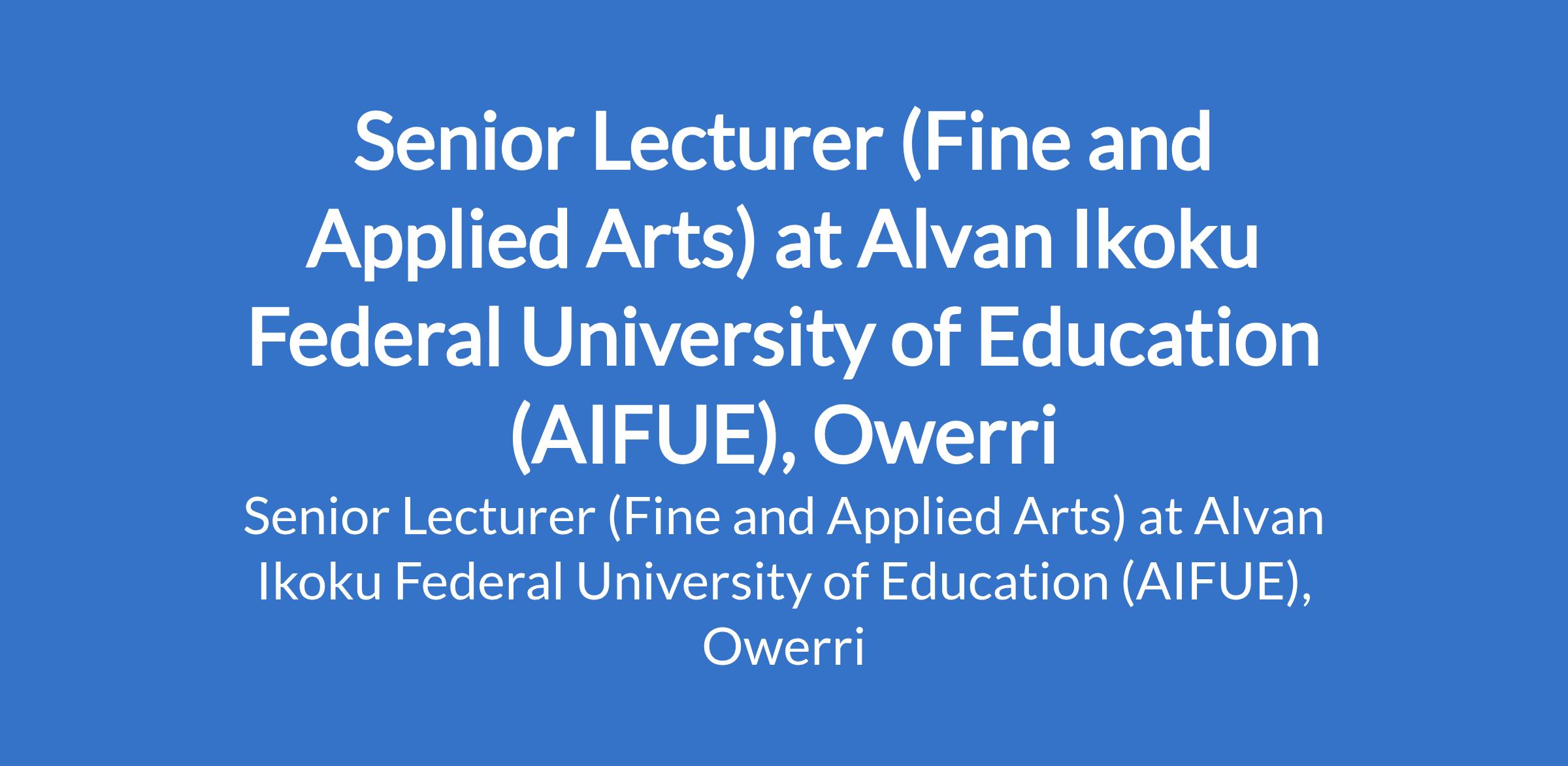 Alvan Ikoku Federal University of Education (AIFUE), Owerri invites applications from suitably qualified candidates for the position of: Senior Lecturer (Fine and Applied Arts). The position is located in Imo State. Interested candidates should possess a PhD with not less than nine (9) years of teaching and research experience, and not less than three (3) years as a Lecturer I in a recognized university.