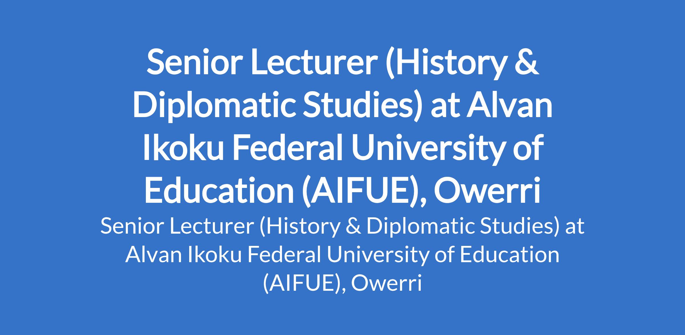 Alvan Ikoku Federal University of Education (AIFUE), Owerri invites applications from suitably qualified candidates for the position of: Senior Lecturer (History & Diplomatic Studies). The position is located in Imo State. Interested candidates should possess a PhD with not less than nine (9) years of teaching and research experience, and not less than three (3) years as a Lecturer I in a recognized university.