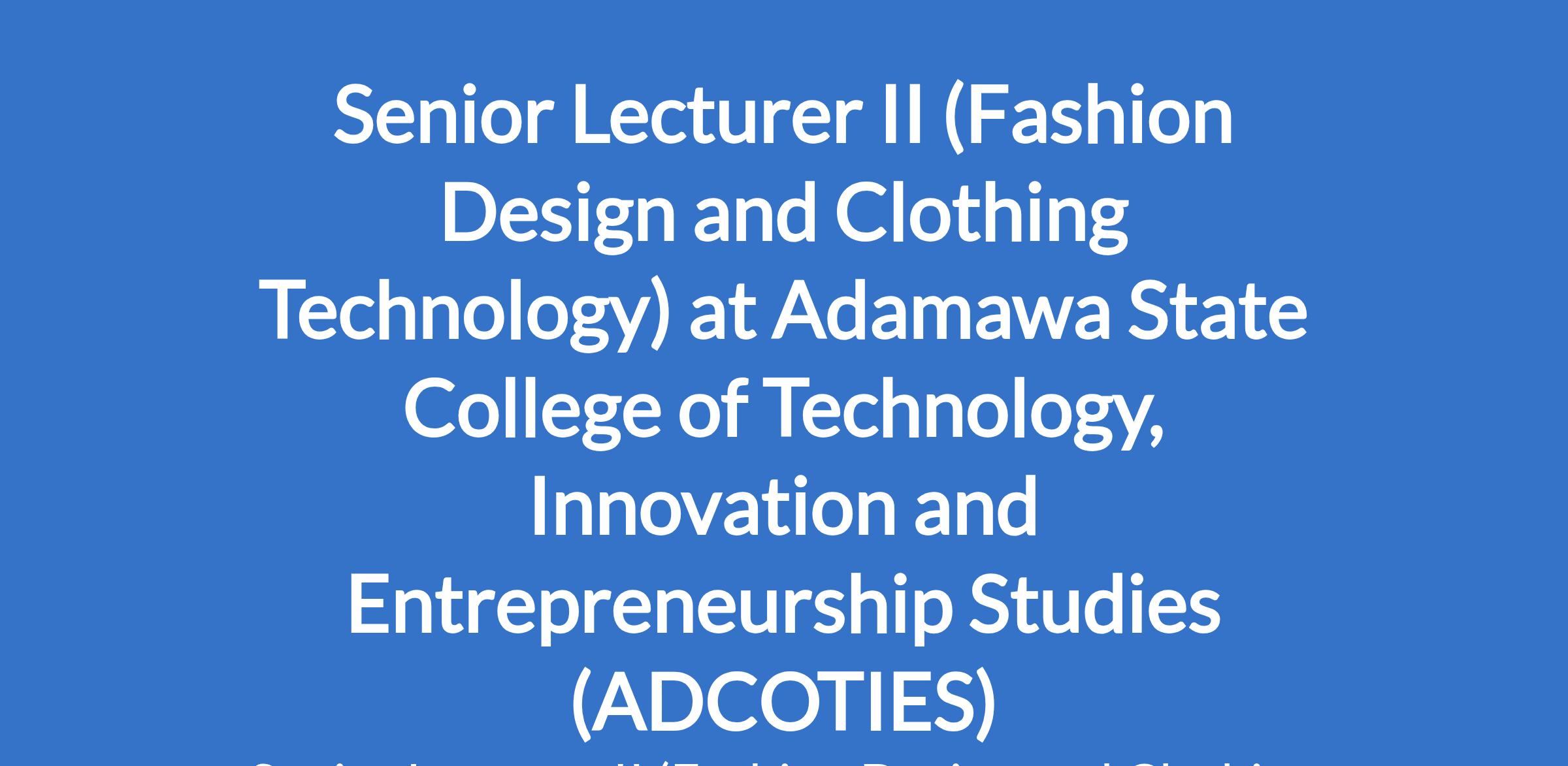 Adamawa State College of Technology, Innovation and Entrepreneurship Studies (ADCOTIES) is recruiting to fill the position of: Senior Lecturer II (Fashion Design and Clothing Technology). The position is located in Gulak, Adamawa State. Interested candidates should possess a Masters Degree in Fashion Technology / Design, Clothing and Textiles, Vocational Studies, from a recognised institution, plus at least 12 years of teaching / research, or industrial work experience OR a PhD in the relevant disciplines above from a recognised institution, plus at least 9 years of teaching / research, or industrial work experience.