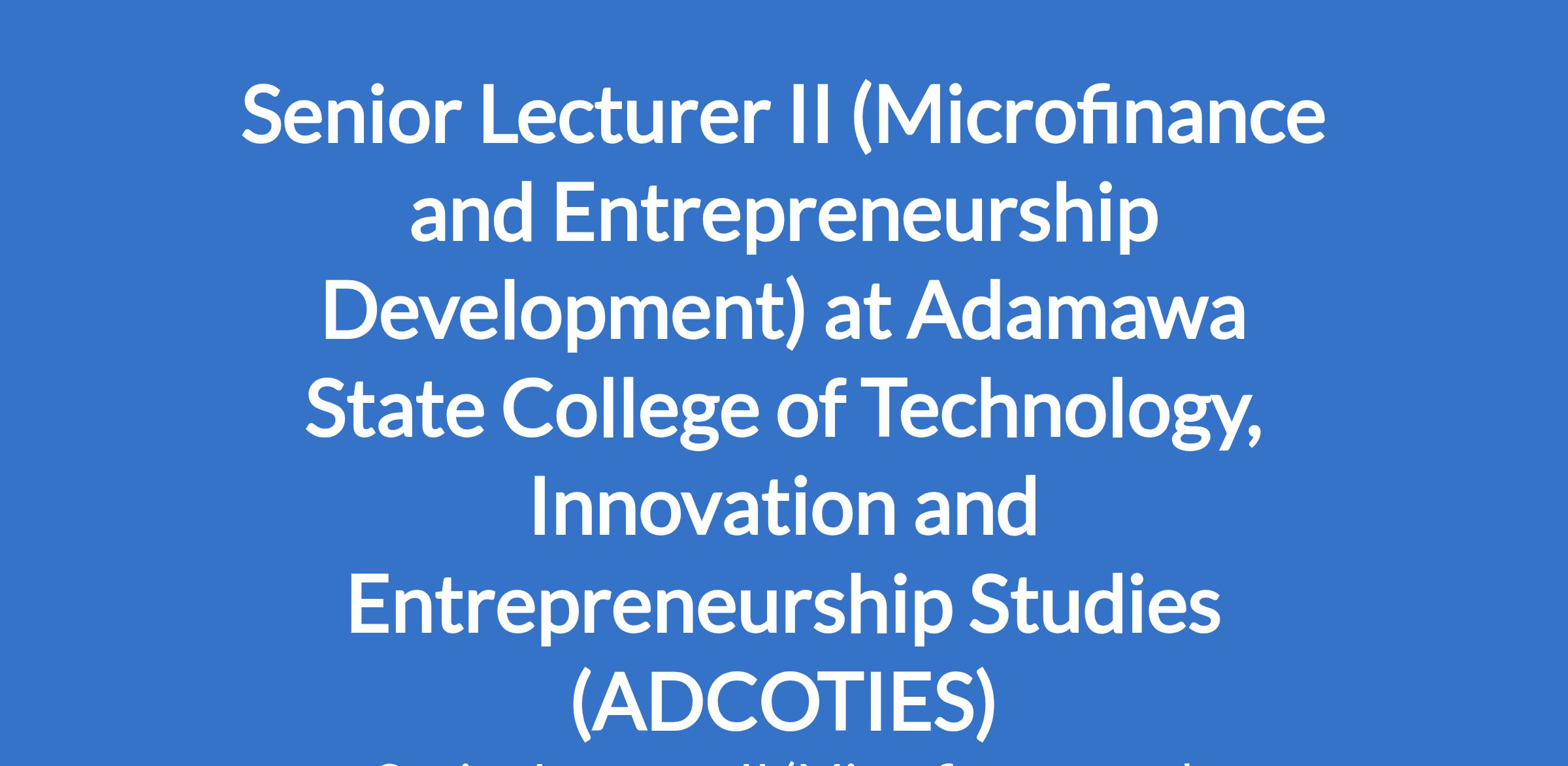 Adamawa State College of Technology, Innovation and Entrepreneurship Studies (ADCOTIES) is recruiting to fill the position of: Senior Lecturer II (Microfinance and Entrepreneurship Development). The position is located in Gulak, Adamawa State. Interested candidates should possess a Masters Degree in Business Administration / Management, Entrepreneurship Studies, Economics, Finance, Microfinance, Enterprise Development from a recognised institution, plus at least 12 years of teaching / research, or industrial work experience OR a PhD in the relevant discipline above from a recognised institution, plus at least 9 years of teaching / research, or industrial work experience.
