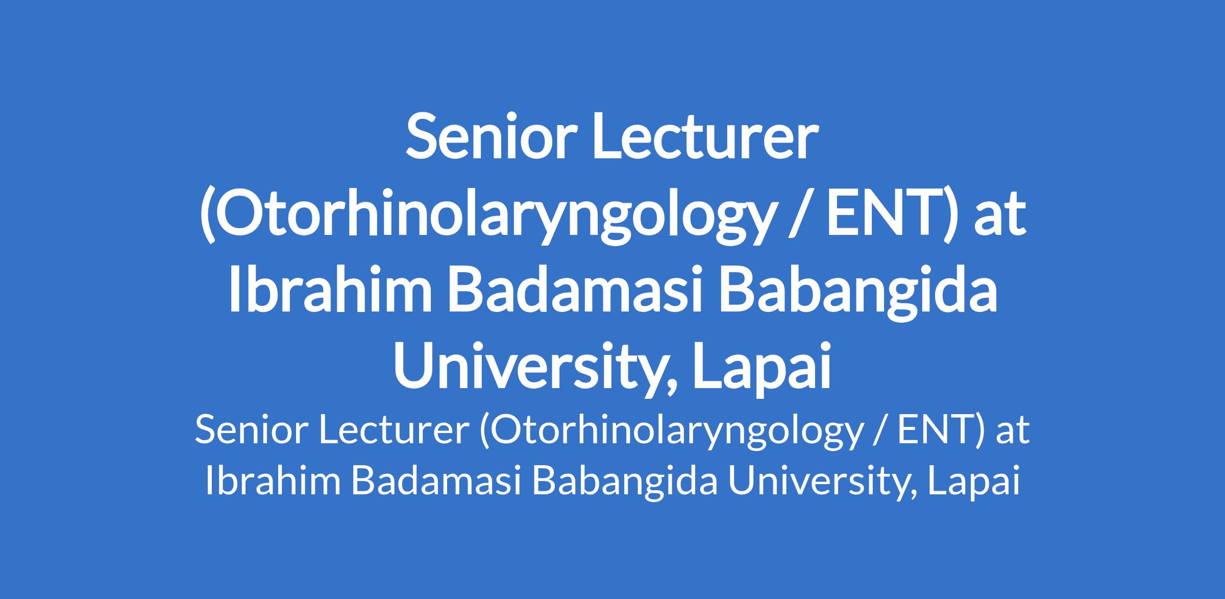 Ibrahim Badamasi Babangida University, Lapai invites applications from suitably qualified candidates to fill the position of: Senior Lecturer (Otorhinolaryngology / ENT). The position is located in Niger State. Interested candidates should be holders of M.B.B.S Degree from recognized Universities with PhD, Fellowship of the National Postgraduate Medical College of Nigeria or its equivalent in the relevant specialty/sub specialty with at least 6 years relevant experience.