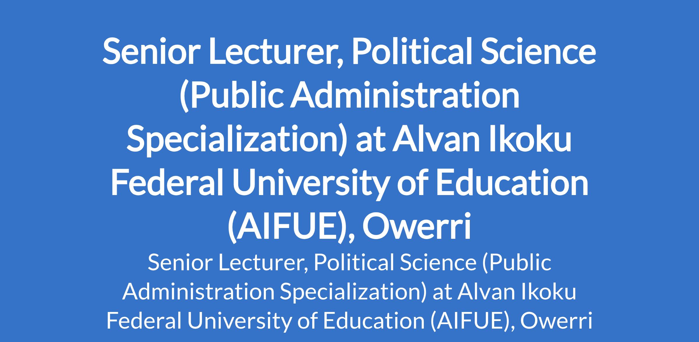 Alvan Ikoku Federal University of Education (AIFUE), Owerri invites applications from suitably qualified candidates for the position of: Senior Lecturer, Political Science (Public Administration Specialization). The position is located in Imo State. Interested candidates should possess a PhD with not less than nine (9) years of teaching and research experience, and not less than three (3) years as a Lecturer I in a recognized university.