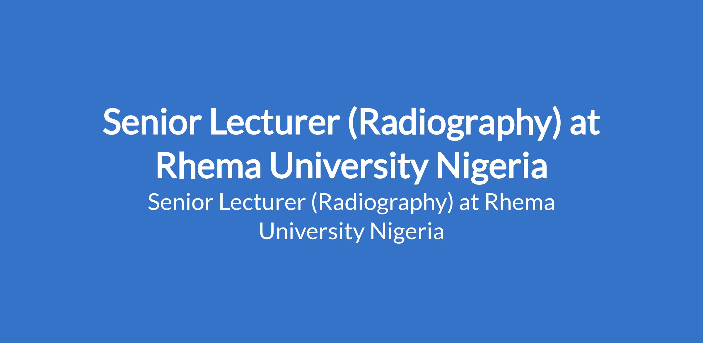 Rhema University Nigeria invites applications from suitably qualified candidates for the position of: Senior Lecturer (Radiography). The position is located in Aba, Abia State. Interested candidates should possess a Ph.D Degree with 5 years post qualification experience in Radiography, and acceptable number of publications.
