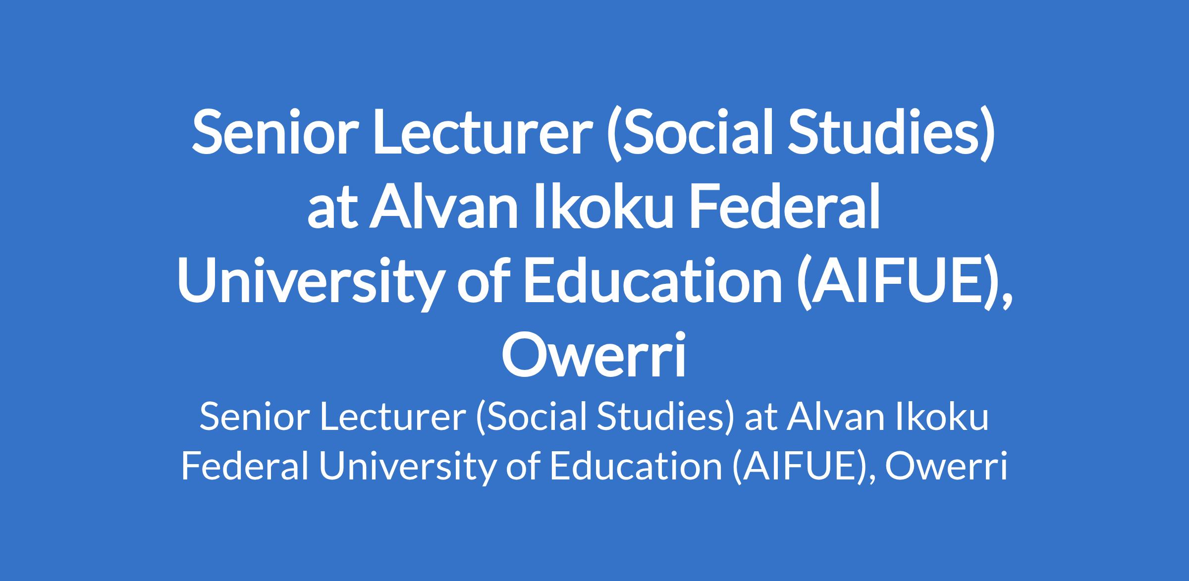 Alvan Ikoku Federal University of Education (AIFUE), Owerri invites applications from suitably qualified candidates for the position of: Senior Lecturer (Social Studies). The position is located in Imo State. Interested candidates should possess a PhD with not less than nine (9) years of teaching and research experience, and not less than three (3) years as a Lecturer I in a recognized university.