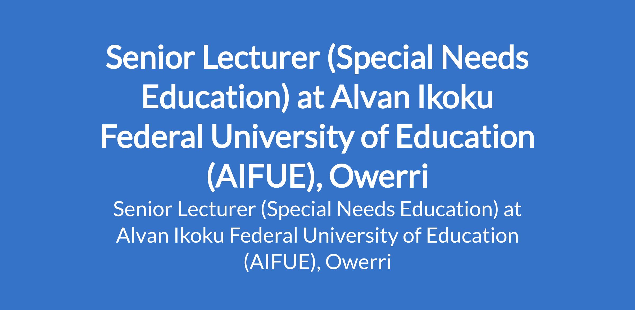 Alvan Ikoku Federal University of Education (AIFUE), Owerri invites applications from suitably qualified candidates for the position of: Senior Lecturer (Special Needs Education). The position is located in Imo State. Interested candidates should possess a PhD with not less than nine (9) years of teaching and research experience, and not less than three (3) years as a Lecturer I in a recognized university.