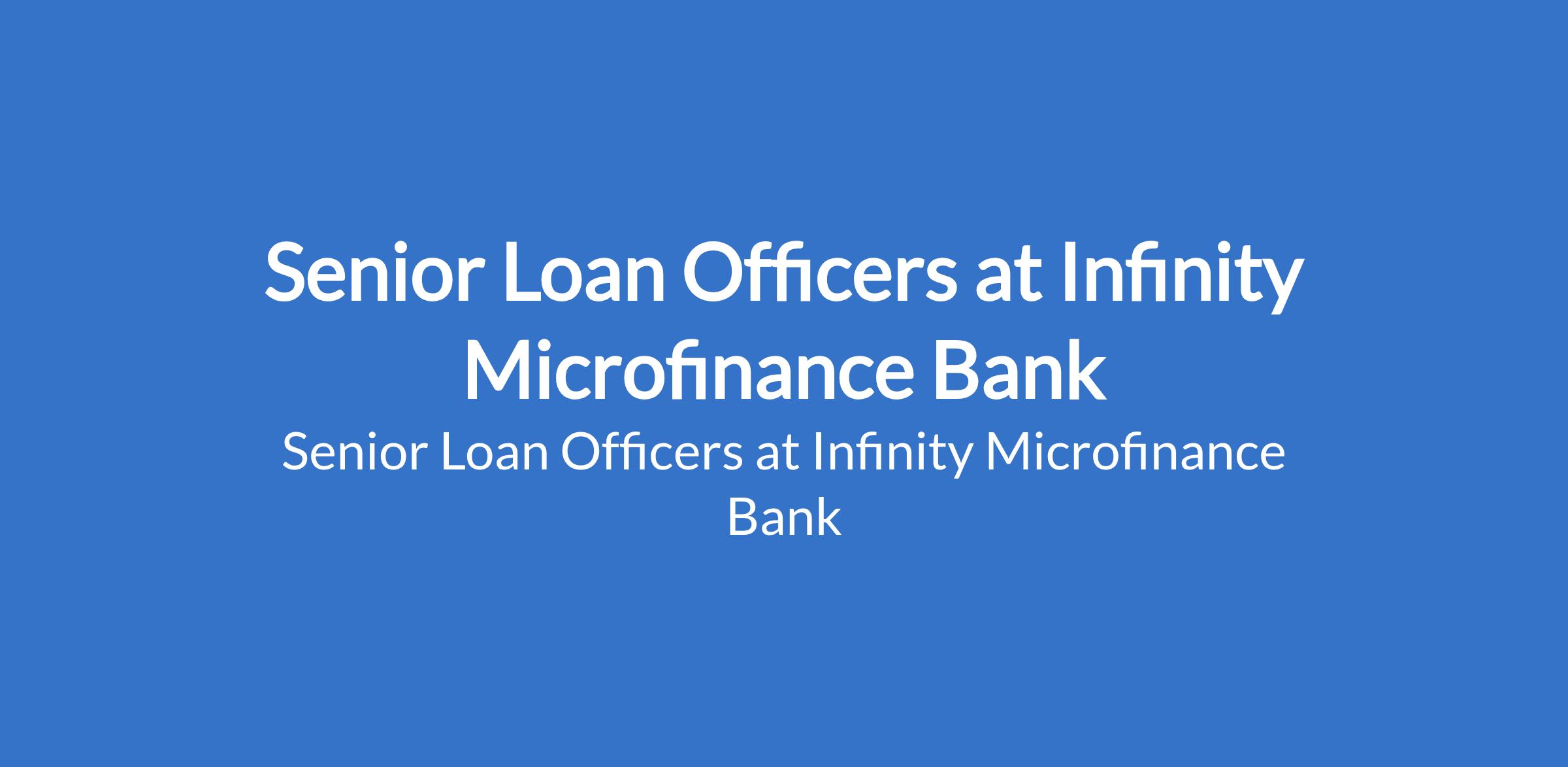 Infinity Microfinance Bank is recruiting to fill the position of: Senior Loan Officer. The position is located in Lagos State. Interested candidates should possess minimum of an HND / BSc Degree in any field of study with a minimum of two years business development experience preferably in the commercial or microfinance banking sector.