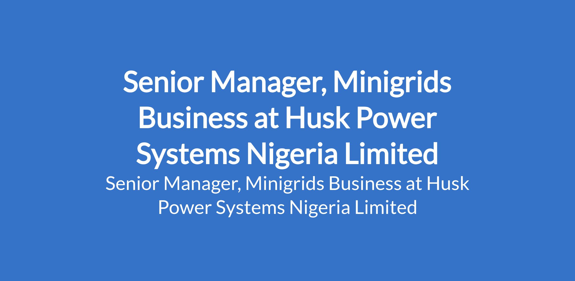 Husk Power Systems Nigeria Limited is recruiting to fill the position of: Senior Manager, Minigrids Business. The position is located in Nasarawa State. Interested candidates should possess a related Degree in Sales, Business Management, and Marketing with 7+ years of relevant sales experience, with 5 years in a similar role within the energy sector.