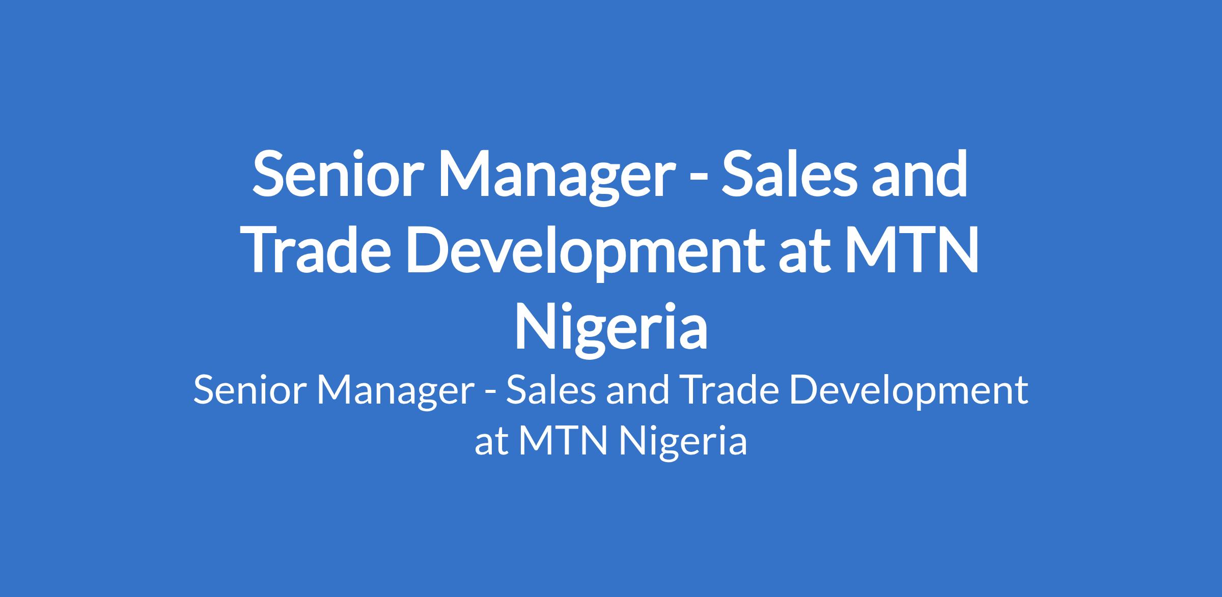 MTN Nigeria is recruiting to fill the position of: Senior Manager - Sales and Trade Development. The position is located in Enugu State. Interested candidates should possess a First Degree in Economics, Business Administration, Commerce or any Social Science with 9 - 17 years work experience.
