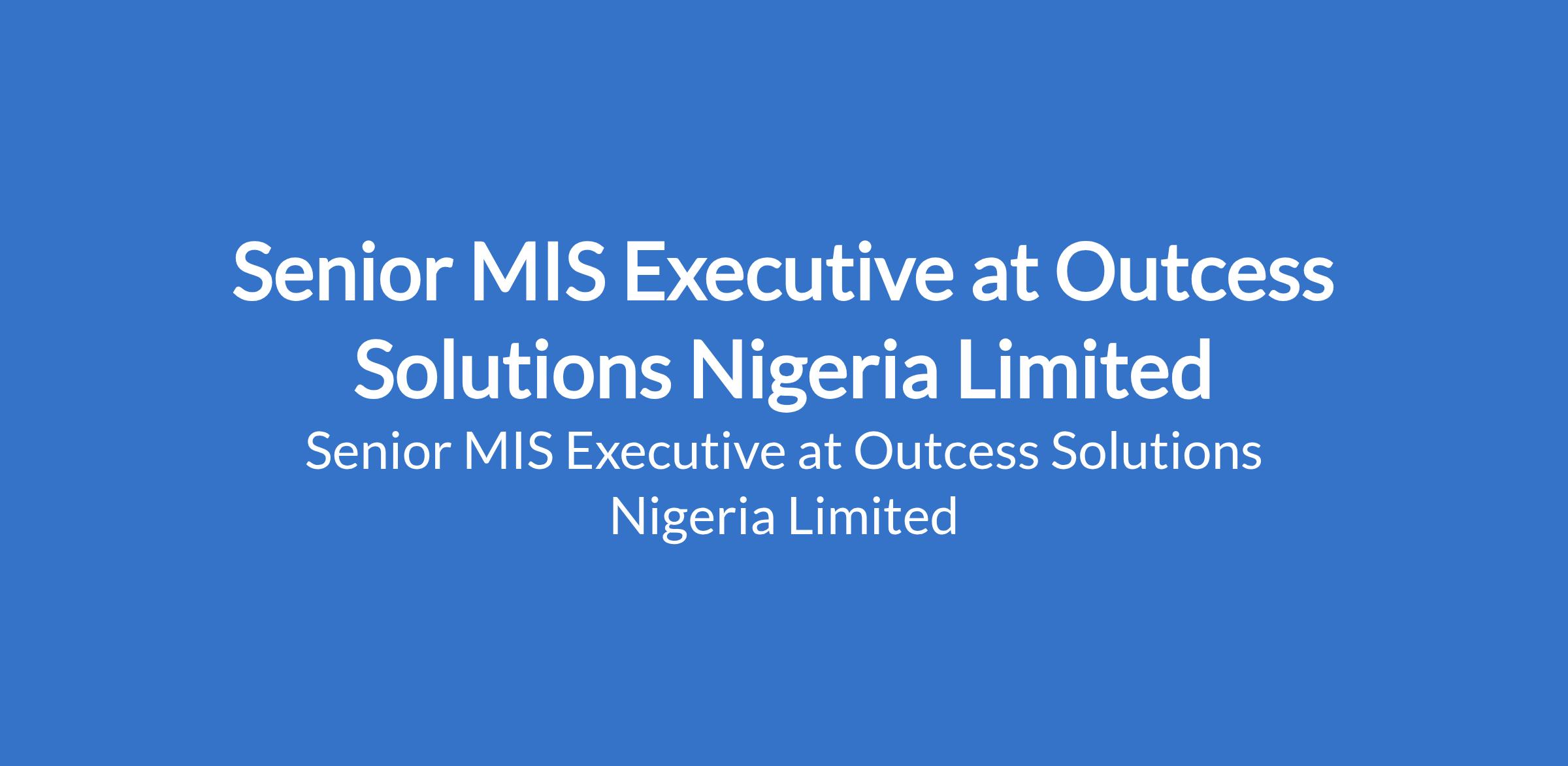 Outcess Solutions Nigeria Limited is recruiting to fill the position of: Senior MIS Executive. The position is located in Ikeja, Lagos State. Salary: N120,000 - N150,000 monthly. Interested candidates should possess a Bachelor`s Degree with 2 - 3 years experience.