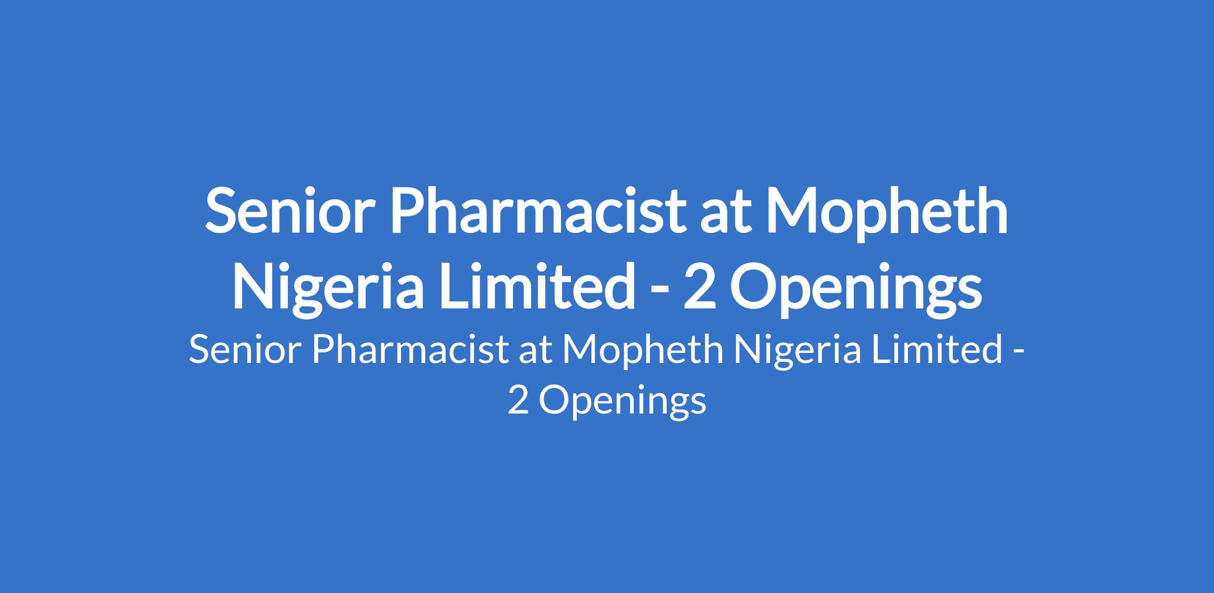 Mopheth Nigeria Limited is recruiting to fill the position of: Senior Pharmacist. The position is located in Lekki and Victoria Island, Lagos State. Salary: N300,000 - N350,000 monthly. Interested candidates should possess a Bachelor of Pharmacy (B.Pharm) or PharmD, must be licensed with the Pharmacists Council of Nigeria (PCN) with 35 years experience in a community pharmacy.