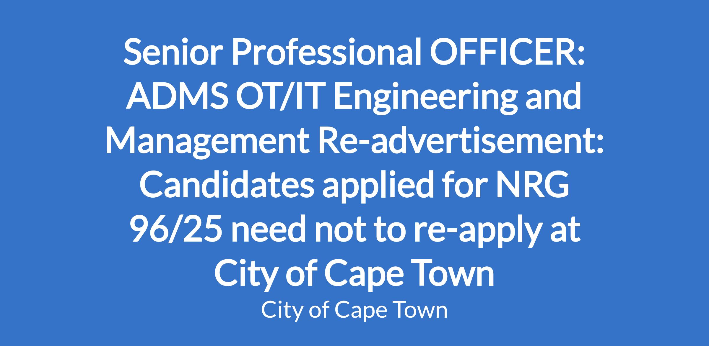 Senior Professional OFFICER: ADMS OT/IT Engineering and Management Re-advertisement: Candidates applied for NRG 96/25 need not to re-apply at City of Cape Town