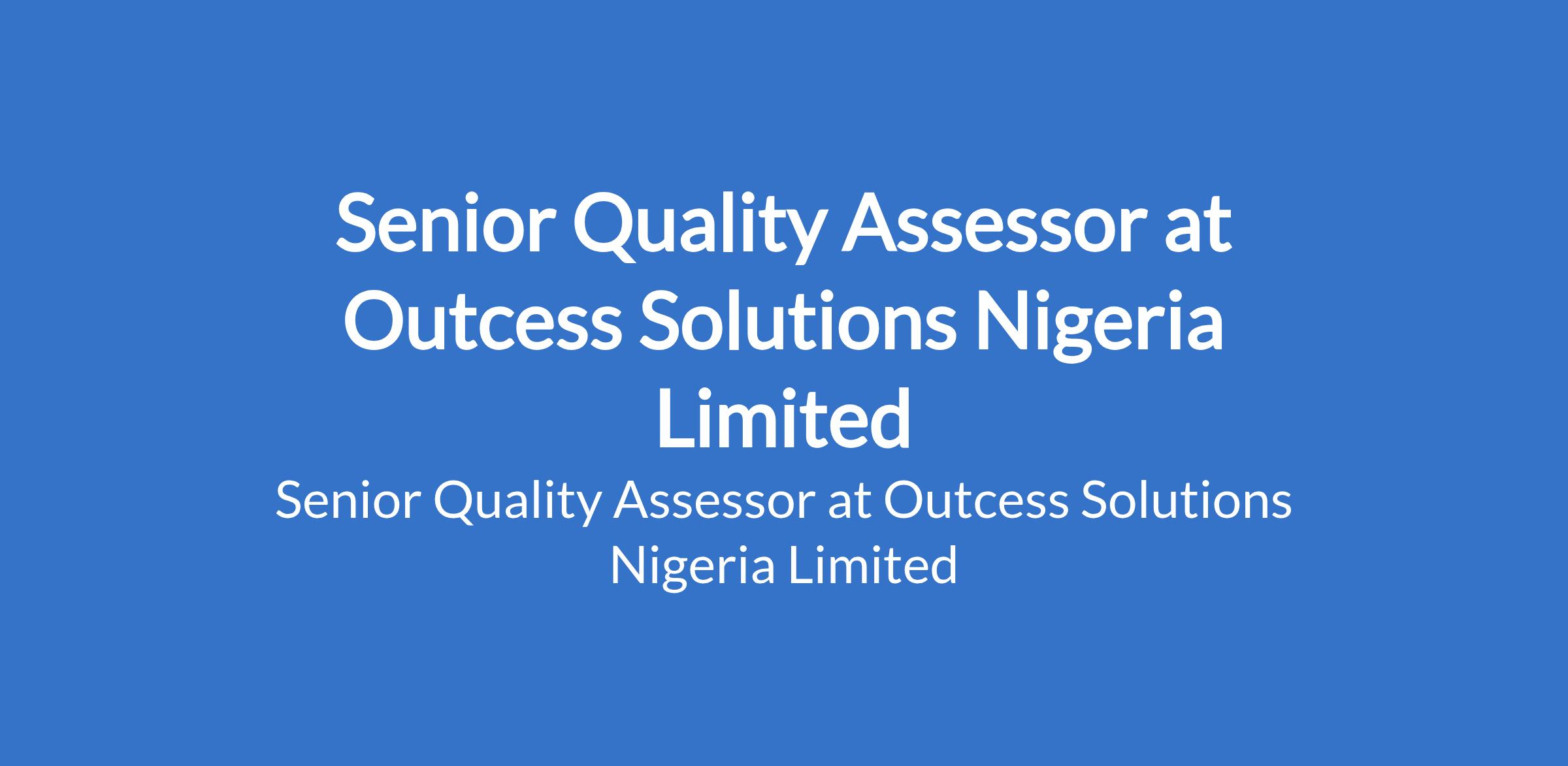 Outcess Solutions Nigeria Limited is recruiting to fill the position of: Senior Quality Assessor. The position is located in Ikeja, Lagos State. Salary N120,000 - N150,000 monthly. Interested candidates should possess a Bachelor's Degree with 2-3 years experience.