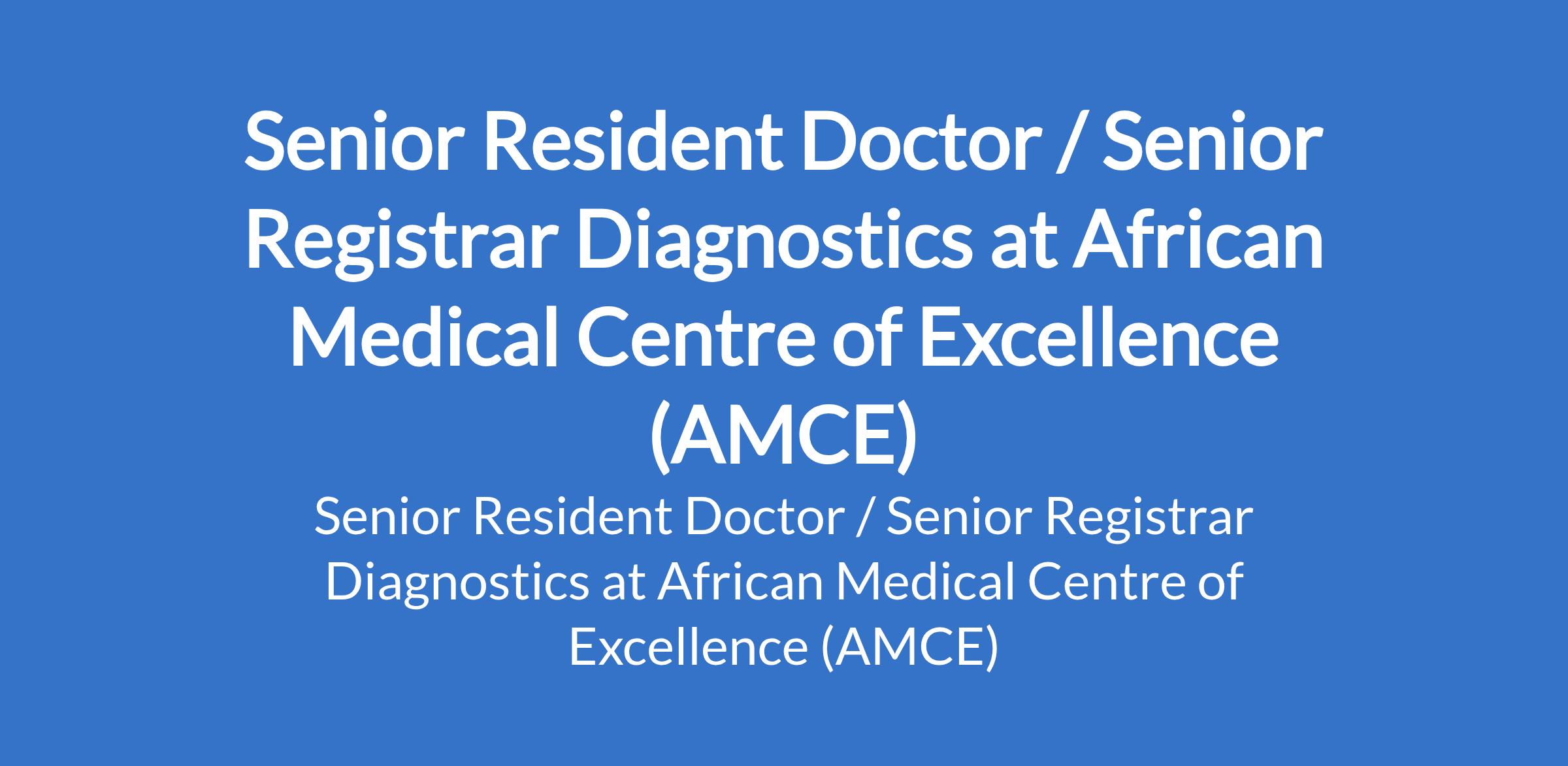 African Medical Centre of Excellence (AMCE) is recruiting to fill the position of: Senior Resident Doctor / Senior Registrar Diagnostics. The position is located in Abuja. Interested candidates should possess a Medical Degree (MBBS, MBChB or its equivalent) from a recognized Institution with completion of at least 4 years residency training in diagnostics and a valid medical license and registration.