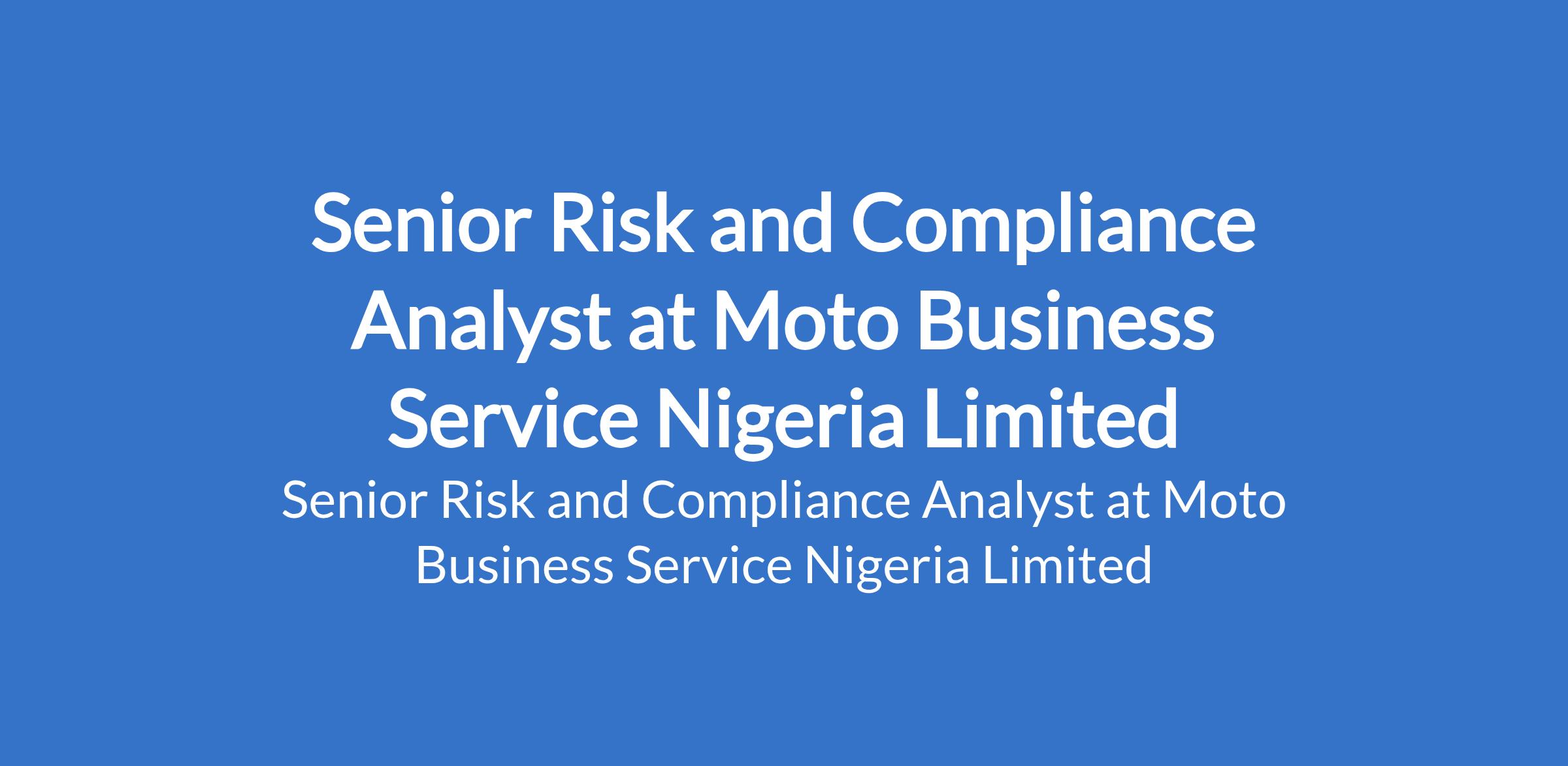 Moto Business Service Nigeria is recruiting to fill the position of: Senior Risk and Compliance Analyst. The position is located in Lekki Phase 1, Lagos State. Salary Range: N500,000 - N700,000 / month. Interested candidates should possess a First Degree / HND in Finance, Mathematics, Statistics, Economics, Data Science, or related field (MBA is a plus) with 57 years post-NYSC experience in Risk, Compliance, Finance, or Data Analysis or similar roles preferably gained at top-tier companies such as tier 1 Financial firms, asset management industry / Leasing, Banking, or Professional Services.