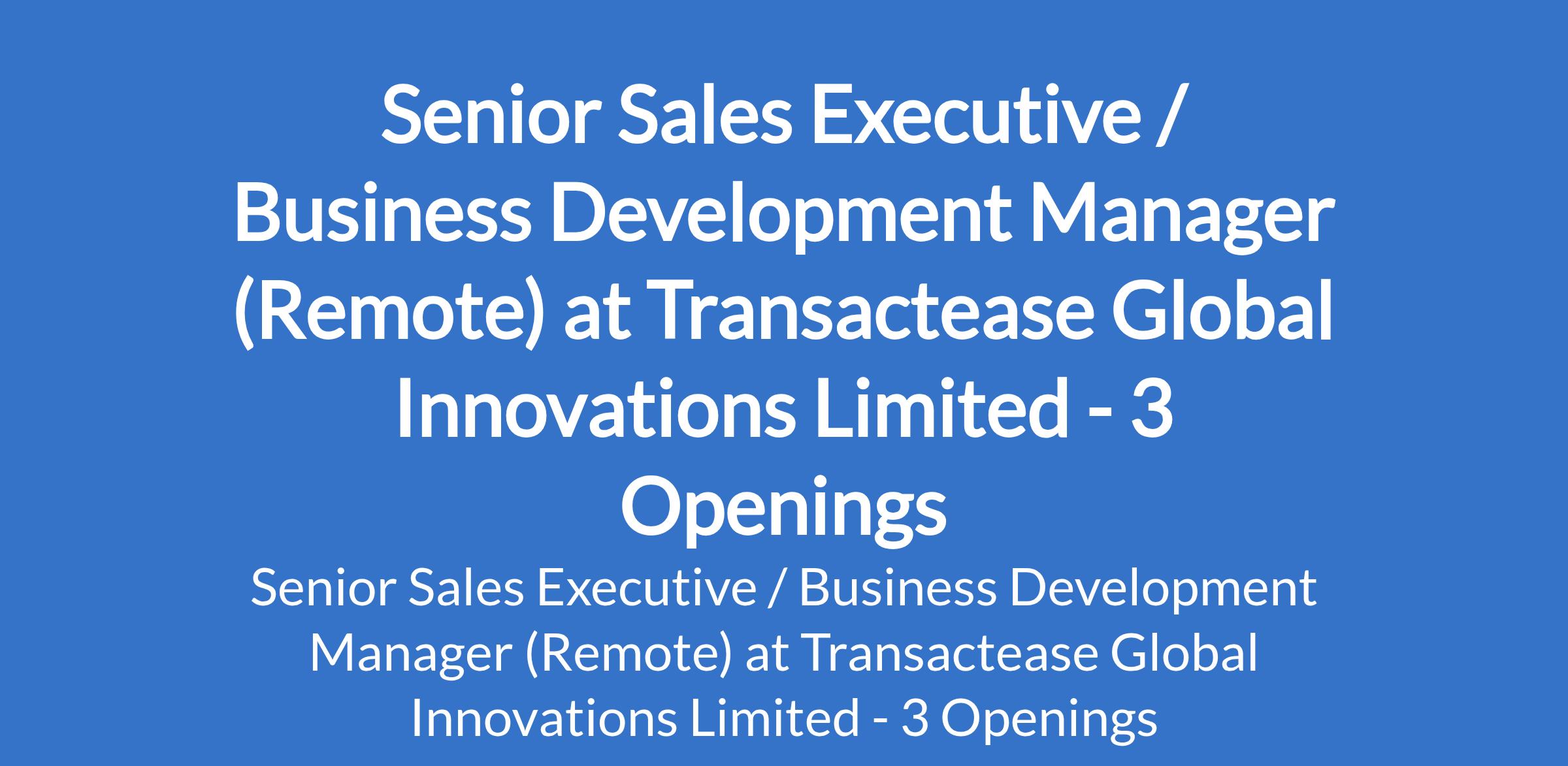 Transactease Global Innovations Limited is recruiting to fill the position of: Senior Sales Executive / Business Development Manager. This is a Remote Job. Salary: N300,000 - N400,000 monthly. Interested candidates should possess relevant qualifications with 47+ years experience in fintech, FX, payments, banking, or SaaS sales.